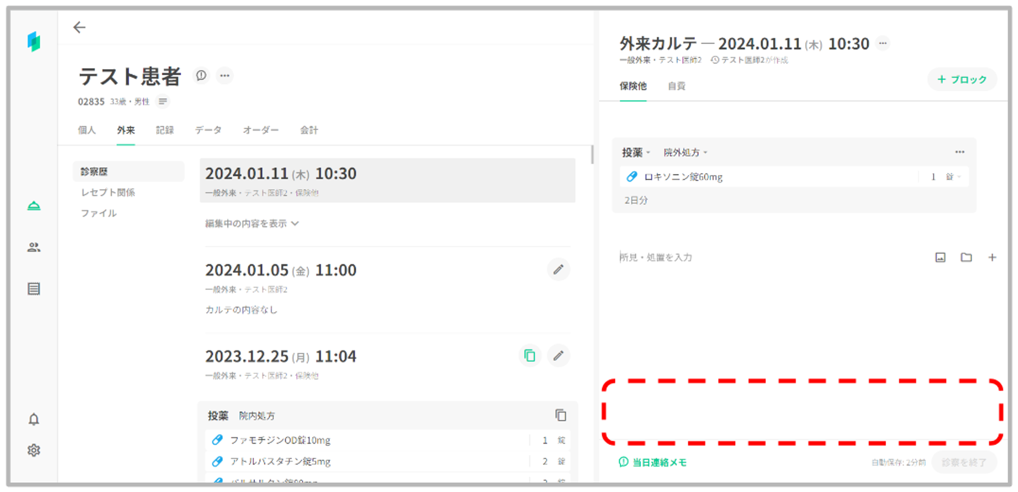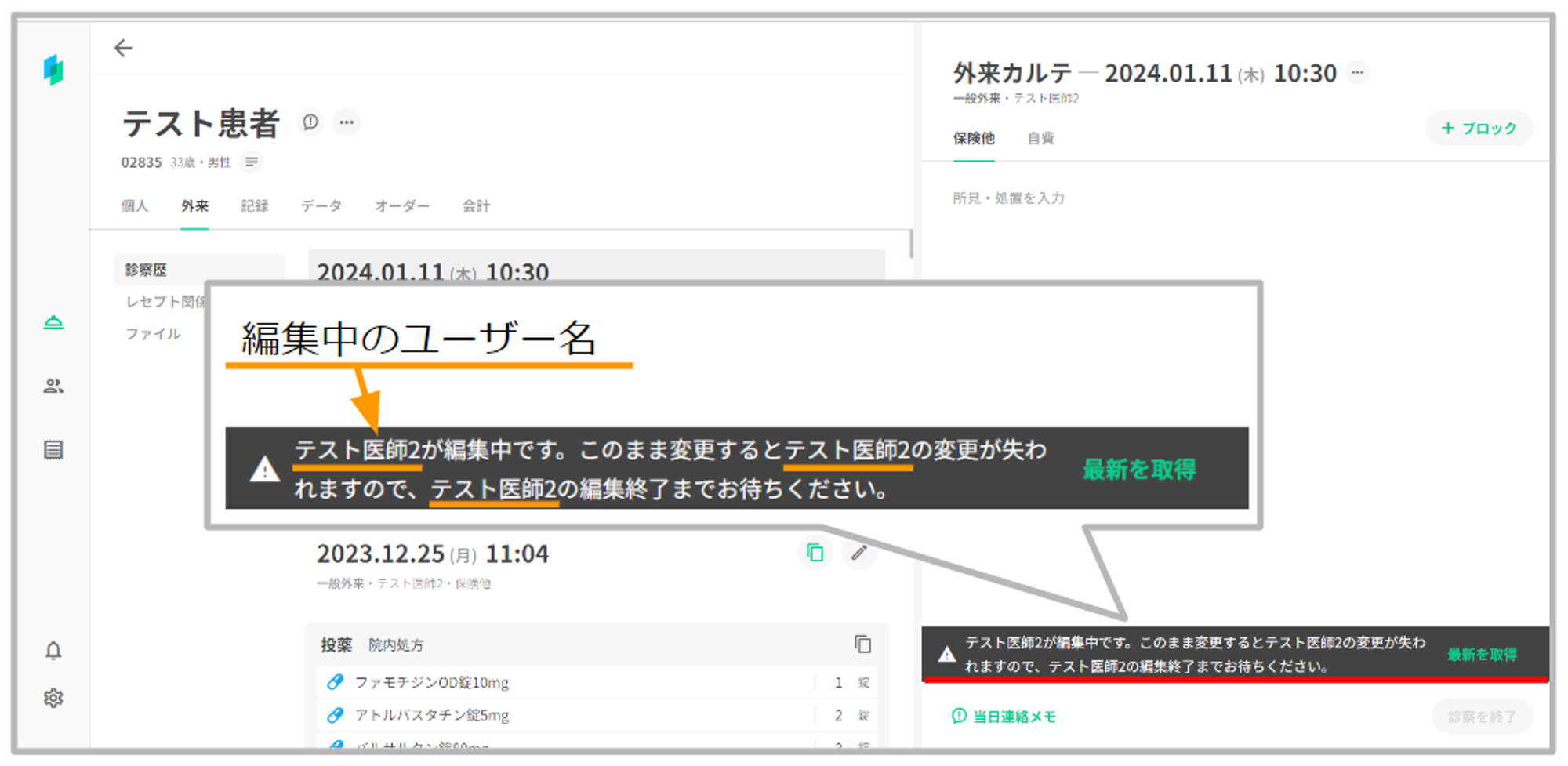 複数のユーザーが同時に同一患者のカルテを編集しようとした場合、同一患者のカルテを編集しているユーザーを明示し、同時編集により記載内容が消えてしまうことを防止できるよう対応いたしました。