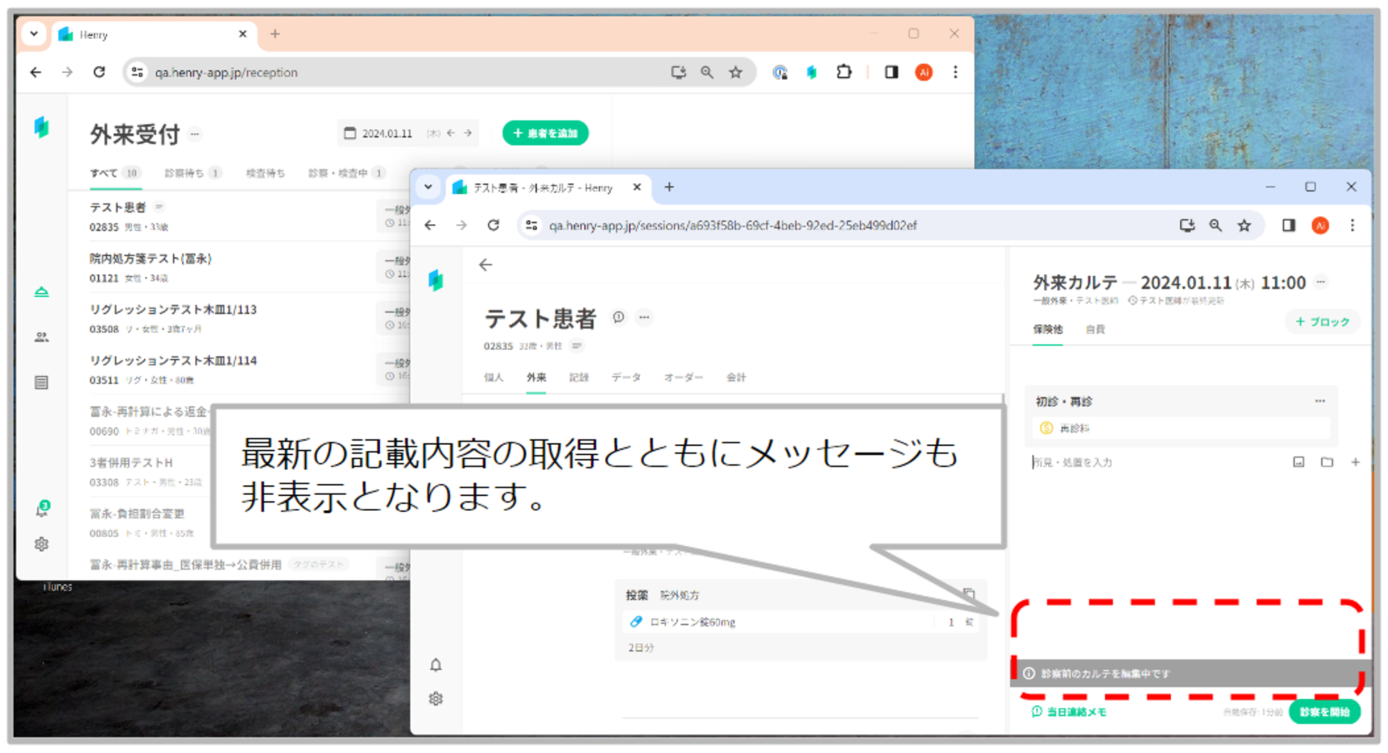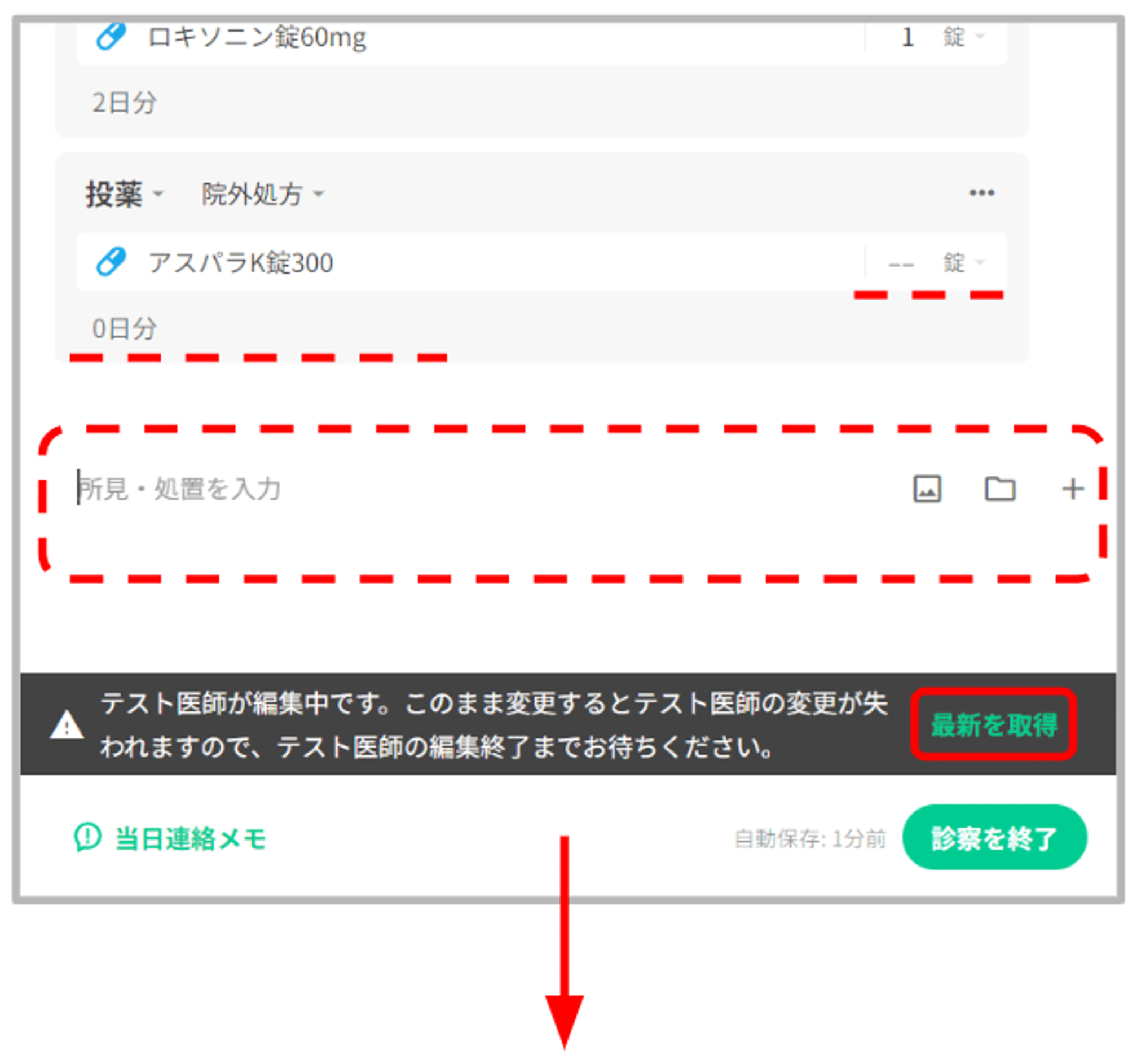 編集していたユーザーがカルテを閉じたり、他の画面へ遷移し、編集中の他ユーザーがいない状態で「最新を取得」ボタンの押下、または画面の更新を行うと、最新の記載内容の取得とともにメッセージも非表示となります。