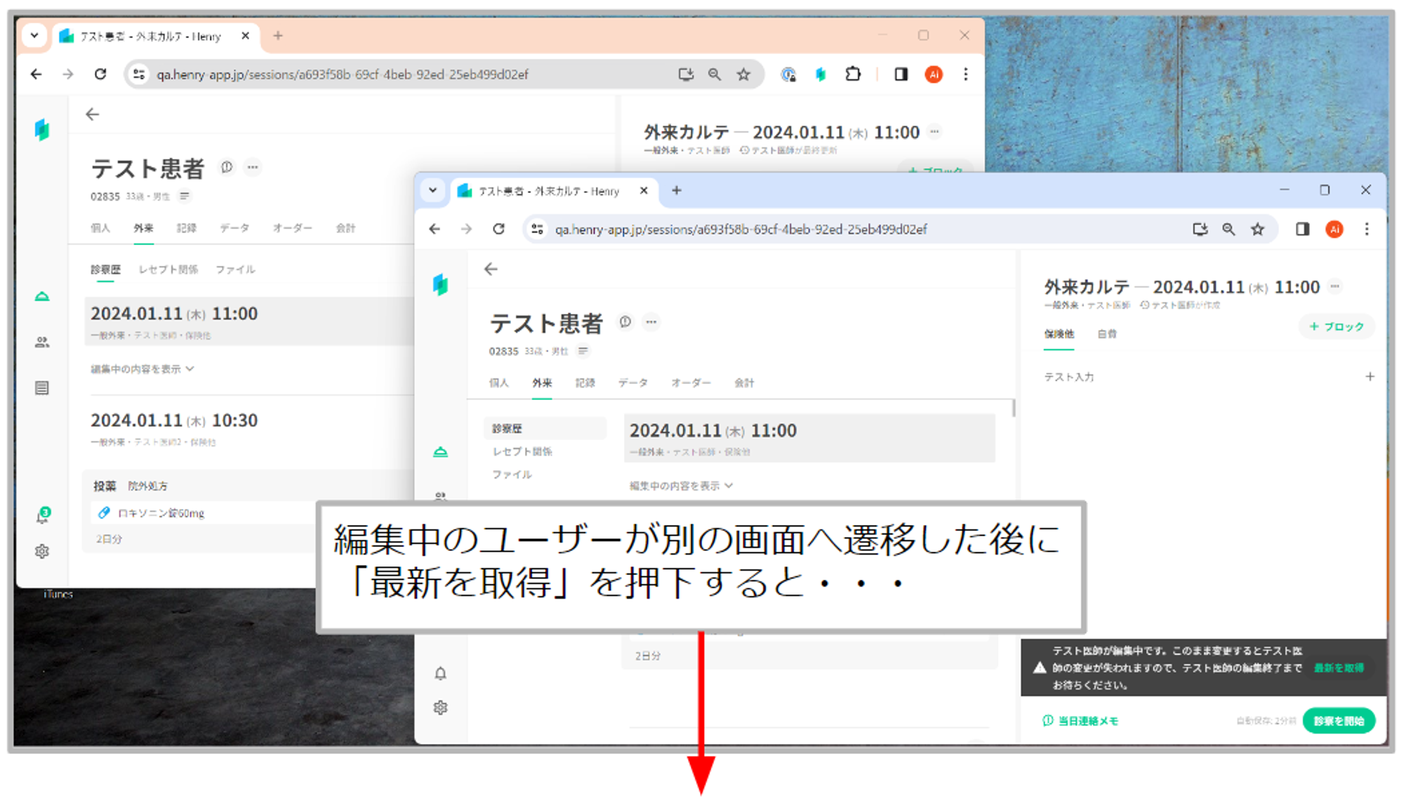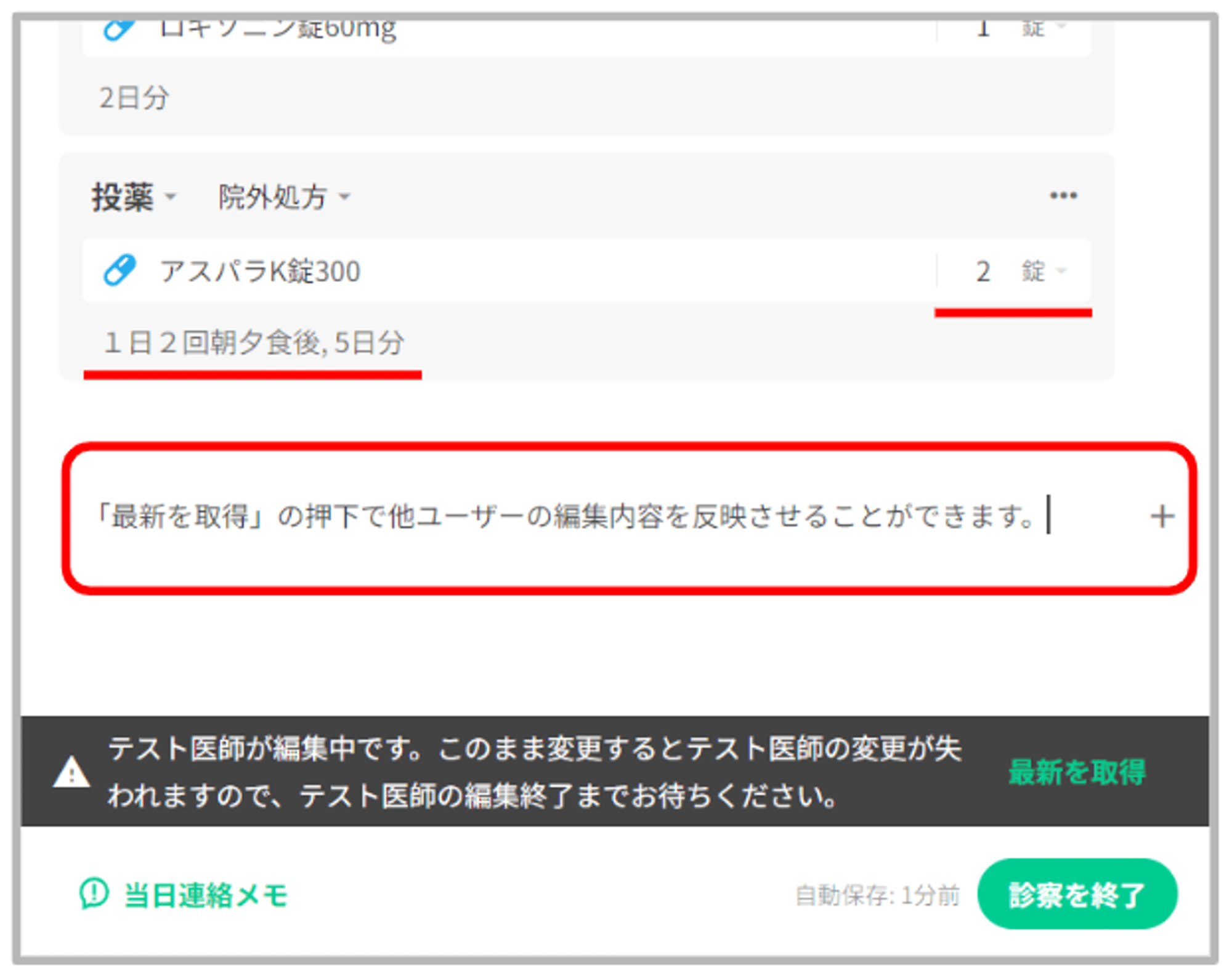 必ず、他ユーザーの編集が完了していることを確認し、カルテを最新の状態へ更新してから編集・保存を行っていただけますようお願い申し上げます。