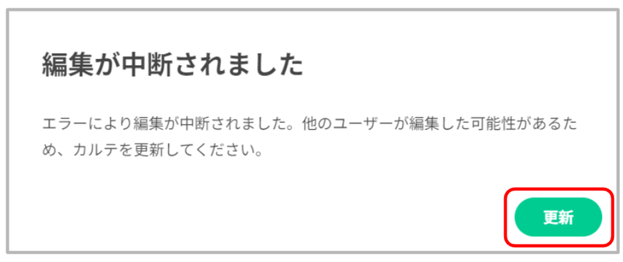 メッセージが表示された状態でも、カルテの編集・保存は可能です。ただし、編集内容が上書きされてしまい、後から書いたユーザーの内容が残り、前に書いたユーザーの内容が消えてしまう可能性があります。