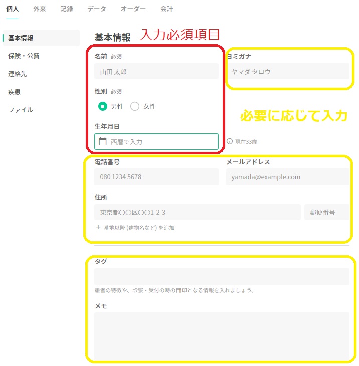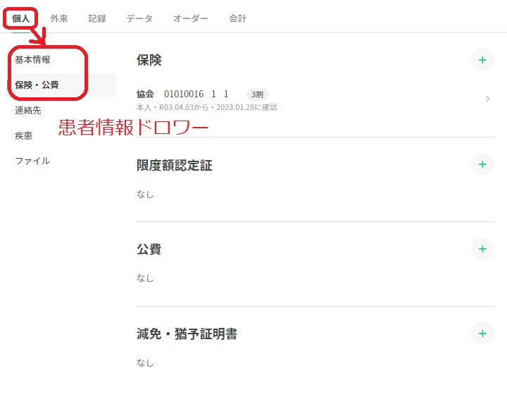 [個人>基本情報]および[個人>保険・公費]にて氏名、生年月日、保険情報などを入力していきます。