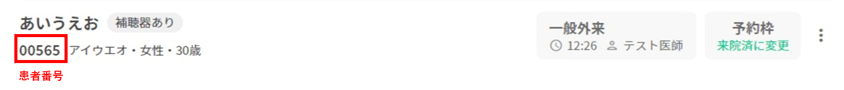 来院手続き(「来院」ボタンの押下)の際に、行われます。 新患の場合、予約の有無に関わらず、来院手続きの際に患者番号が付番されます。 再診患者の場合、既に患者番号が付番されている状態です。