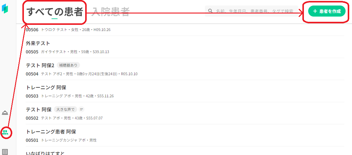 [すべての患者]にて「+患者を作成」を押すと右側に患者情報を記入する欄が表示されます。