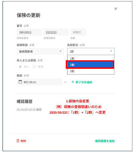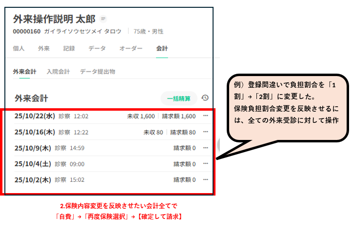 該当月のの会計(保険・公費登録内容変更を反映させたい会計全て)で日付の古い順に以下の操作を行ってください
