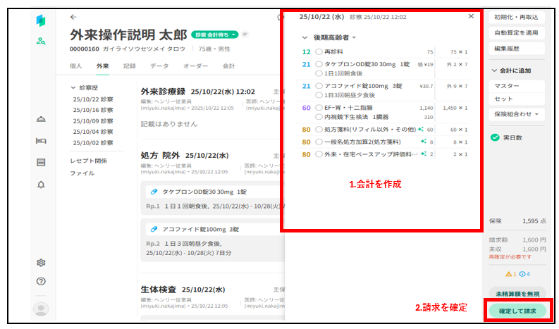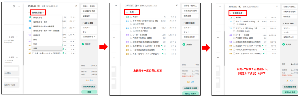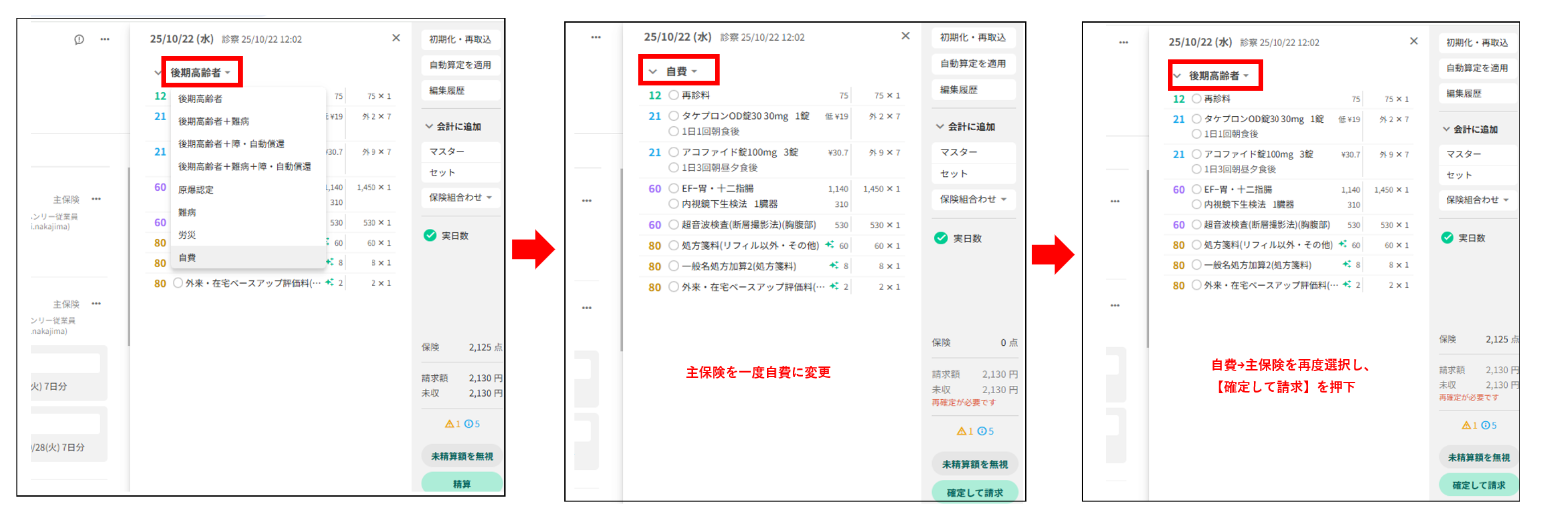 保険を一度「自費」に変更→再度、正しい保険を選択→【確定して請求】を押下
