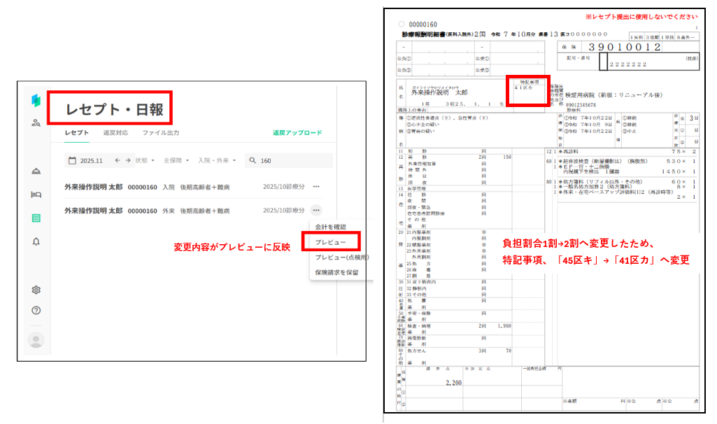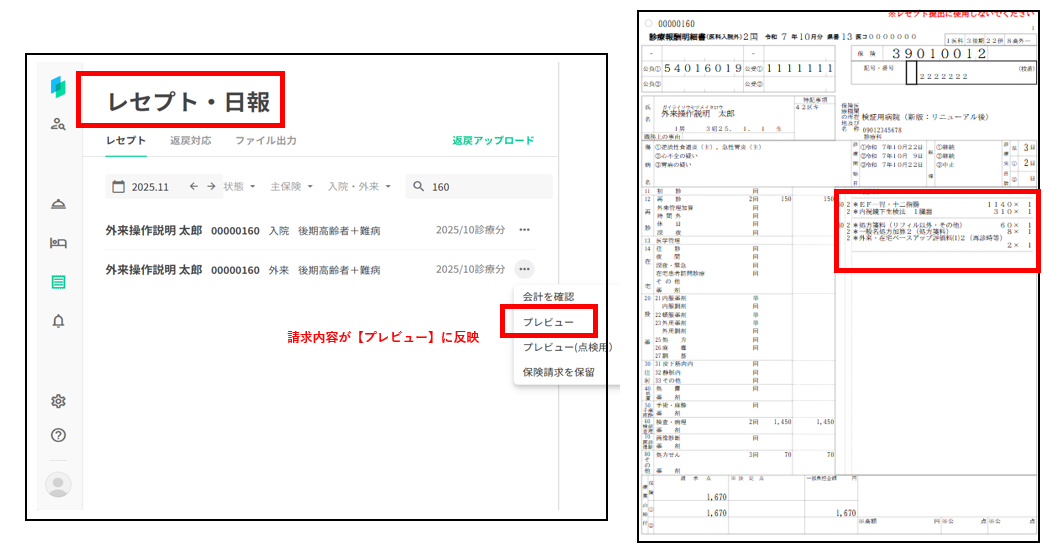 ※「レセプト・日報」画面のレセプト【プレビュー】に、請求確定内容が反映されます