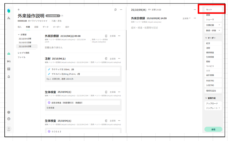 カルテ編集画面右上の【セット】ボタンを押下し、セット選択画面を開きます
