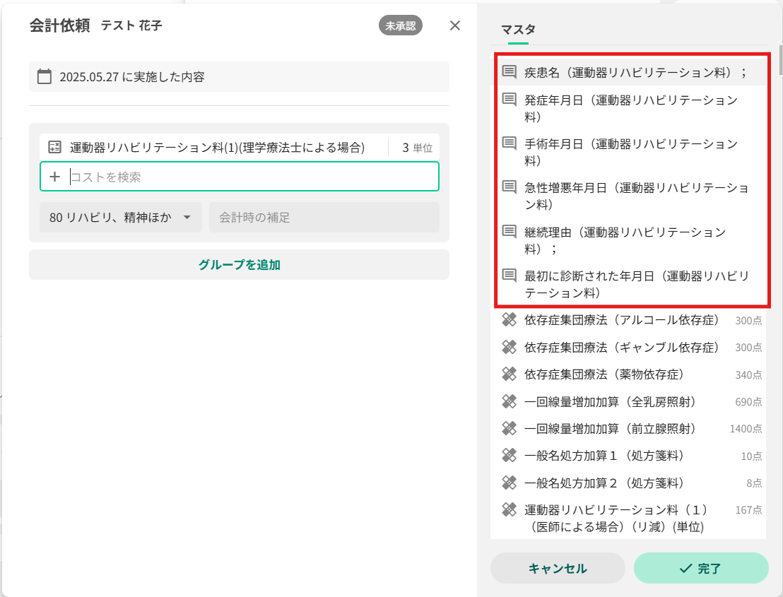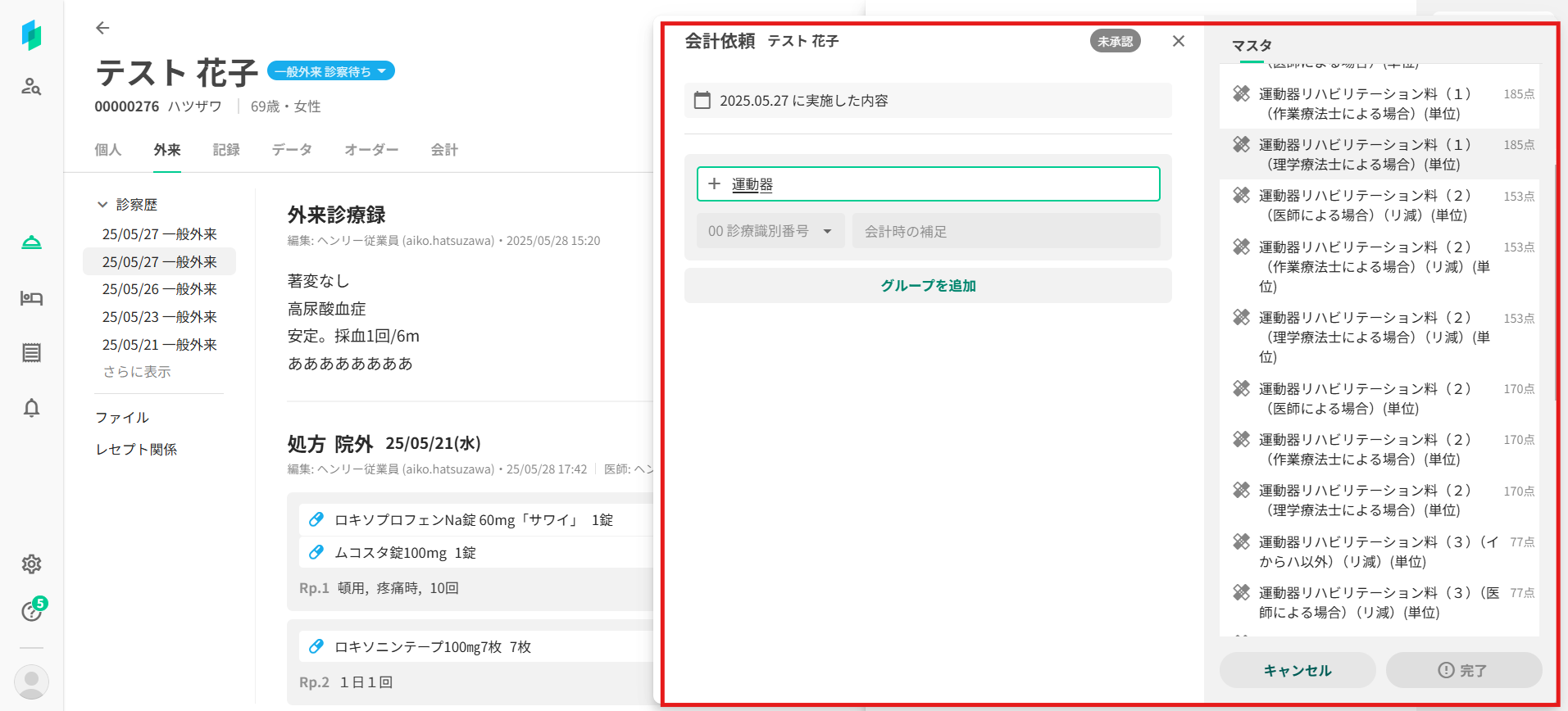 リハビリテーションオーダーについては従来と同様にご利用いただけますが、従来同様リハビリ記録から外来のコスト連携がありませんので、カルテを開き会計依頼から直接コストを入力する手順となります。