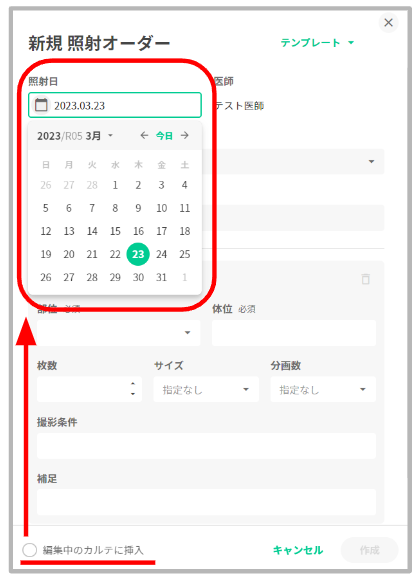 「 編集中のカルテに挿⼊ 」が有効になっている場合は、照射⽇が紐づくカルテの診療⽇となり、変更できません。