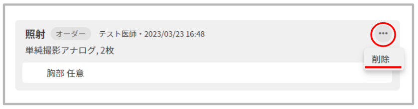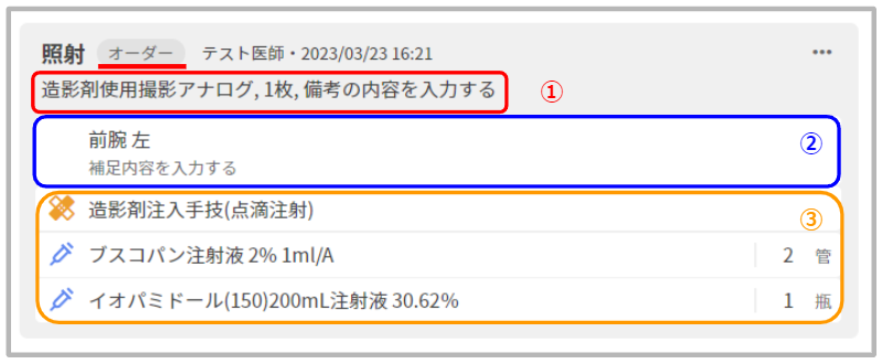 追加されたグループにはタイトル横に「オーダー」と表記され、上から順に「①:種別、備考の内容」「②:部位、体位、補⾜の内容」「③:造影剤注⼊⼿技料、医薬品」が表⽰されます。