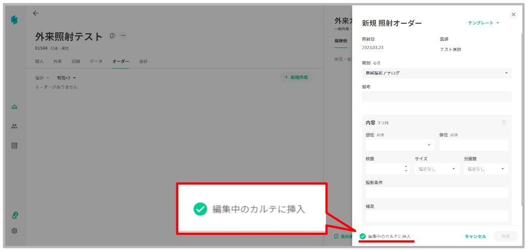 「 編集中のカルテに挿⼊ 」にチェックを付けた状態でオーダーを作成すると、開いている外来カルテに照射オーダーのグループが追加されます。