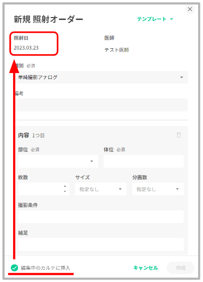 診察中のカルテを開いた状態で照射オーダーの作成画⾯を開くと左下に「 編集中のカルテに挿⼊ 」のチェックボックスが表⽰されます。デフォルトは✅が有効となります。