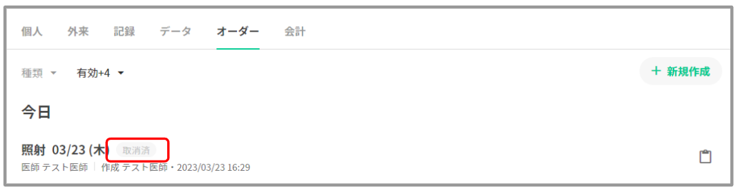エラーメッセージのOKを押下しカルテ上のグループ削除を⾏うと、連携元の照射オーダーは 取消済 となります