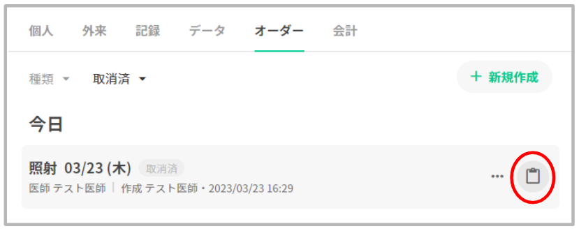 外来カルテに紐づけ後に取り消された照射オーダーにも カルテアイコン は表⽰され、アイコンを押下すると紐づけていた外来カルテ画⾯へ遷移します。