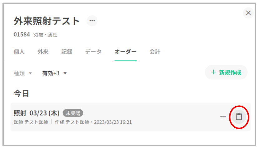 外来カルテに紐づいている場合は、照射オーダーに カルテアイコン が表⽰されます。