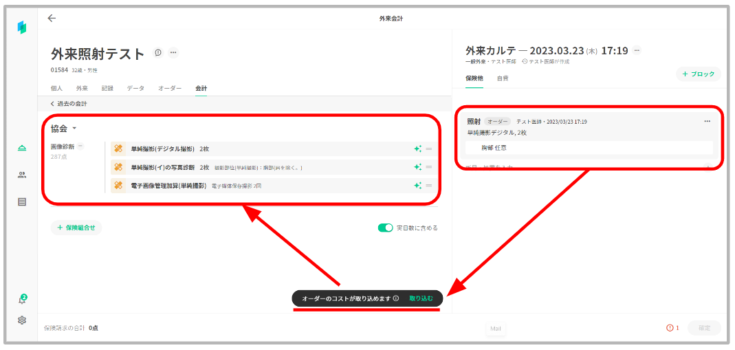 カルテに紐づけた照射オーダーコストを会計画⾯で取り込むことができます。 カルテに紐づいた照射オーダーがある場合、会計画⾯へ遷移すると「オーダーのコストが取り込めます」のメッセージとともに「 取り込む 」ボタンが表⽰されます。