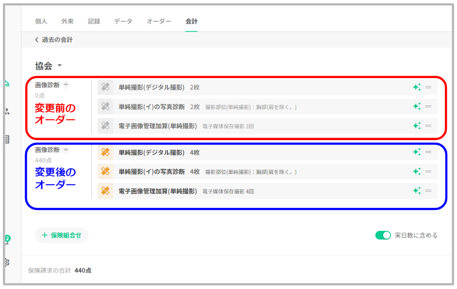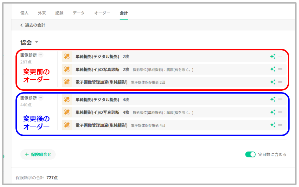 「 取り込む 」を押下すると変更された照射オーダーの内容が新たな算定単位で追加されます。