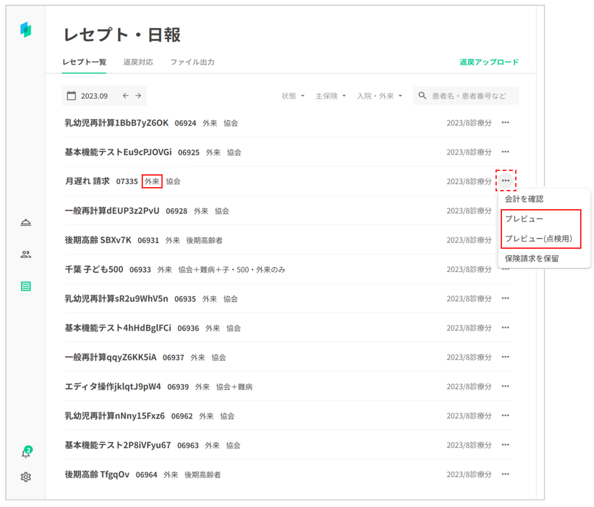 外来のレセプトデータの「…」を押下し、「プレビュー」「プレビュー(点検用)」メニューが表示されます。