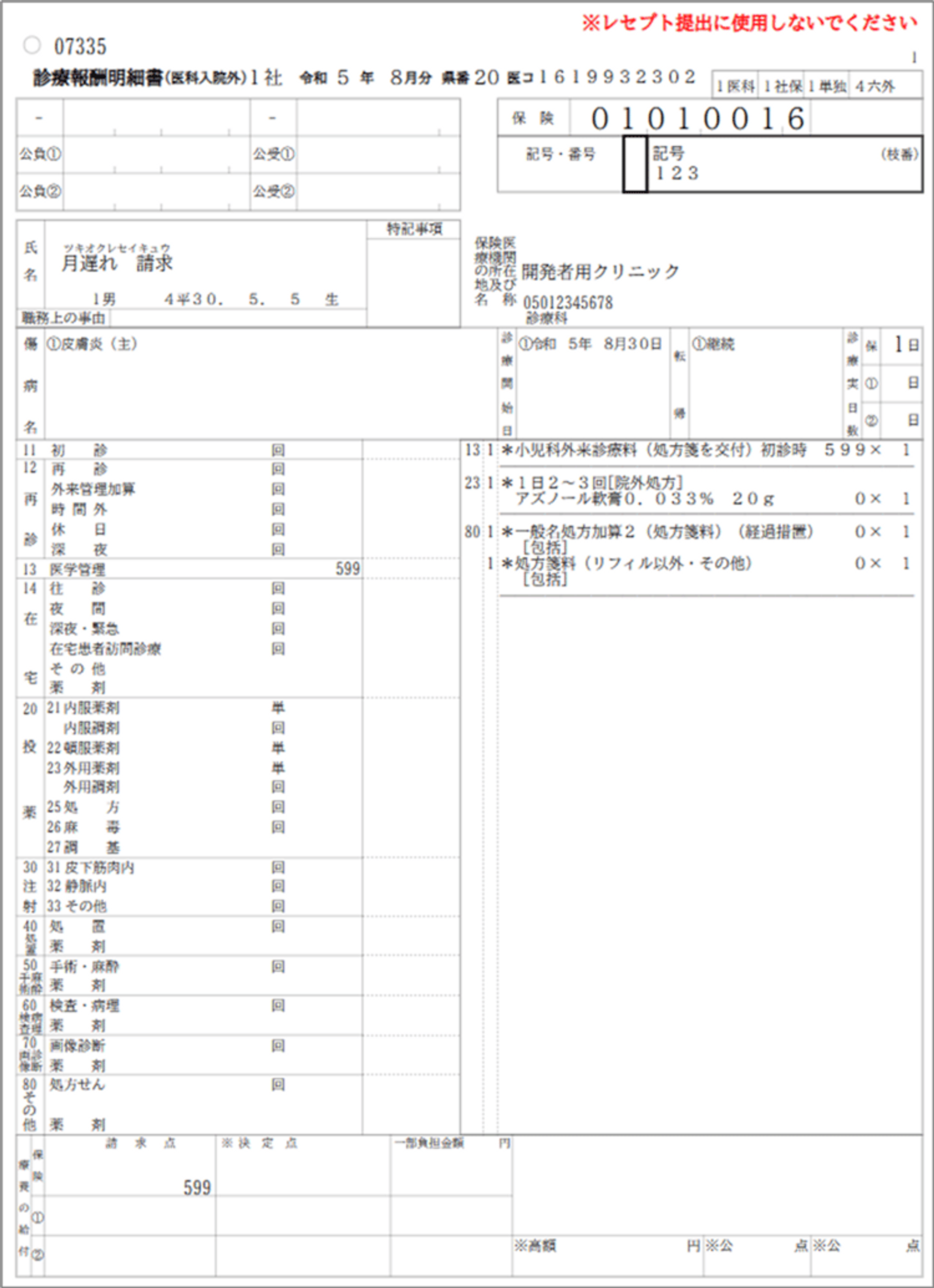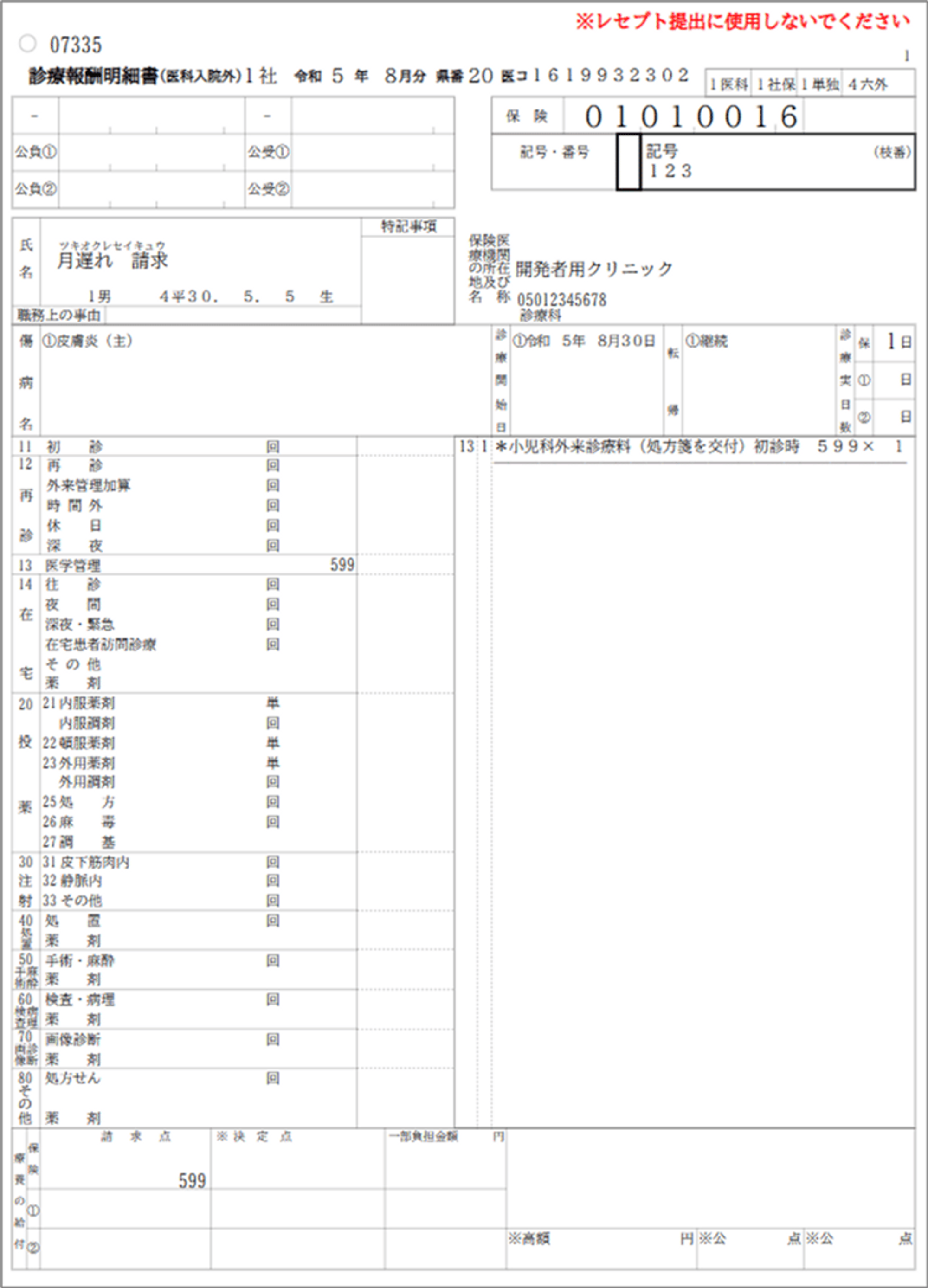 「プレビュー」ボタンを押下すると外来のレセプトプレビュー画面が表示されます。