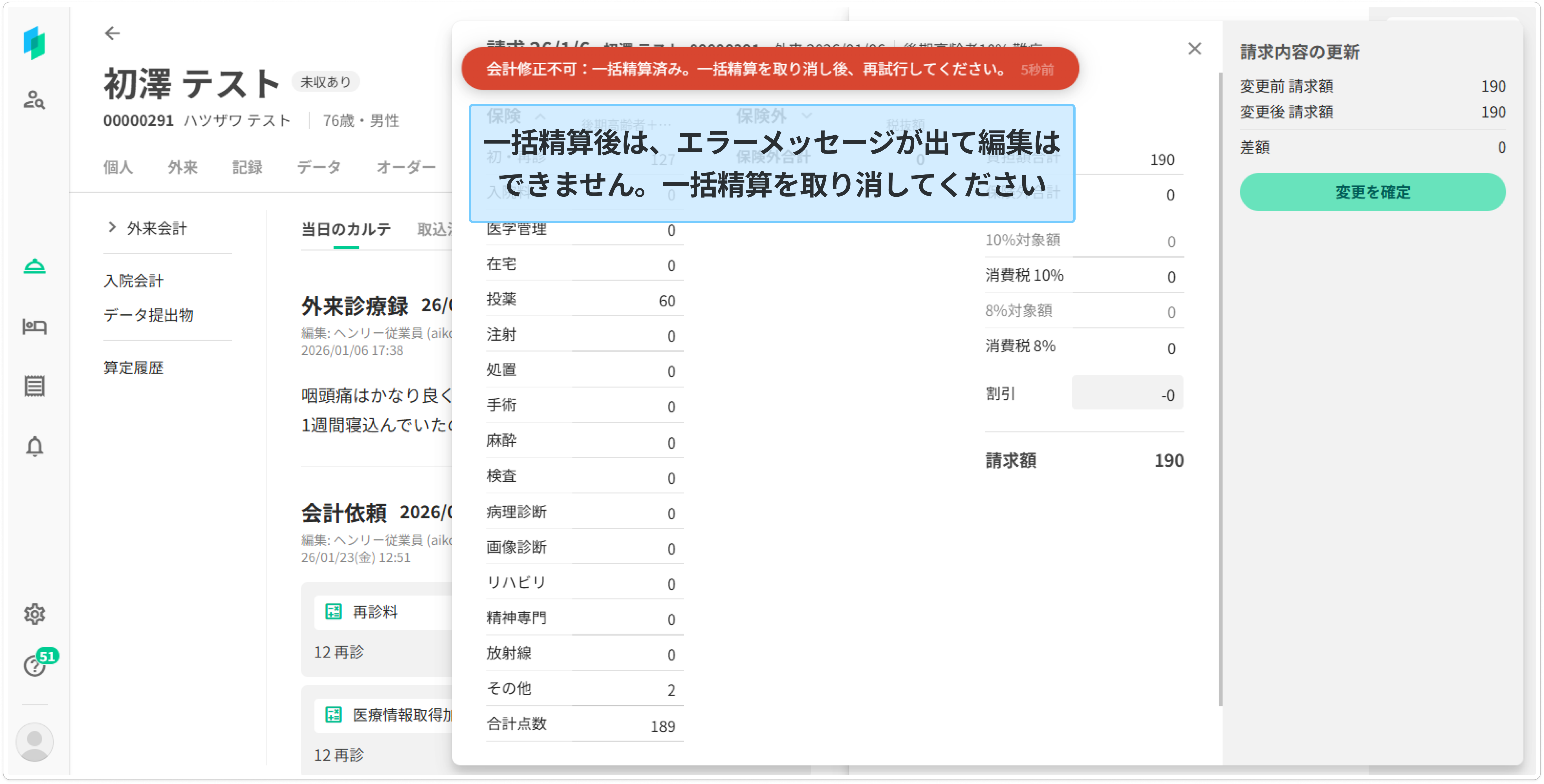 一括精算済の会計内容を編集し請求を確定しようとすると、エラーメッセージが出て確定することができません
