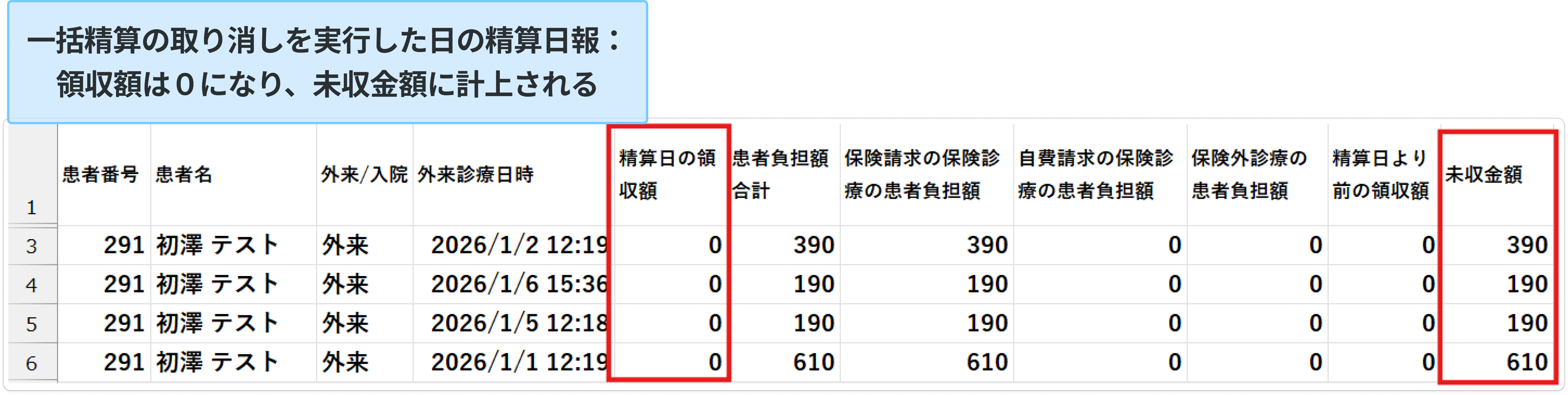 一括精算の取り消しを実行した日の精算日報には、取り消したすべての会計が領収額0、未収金額に計上されて表示されます。
