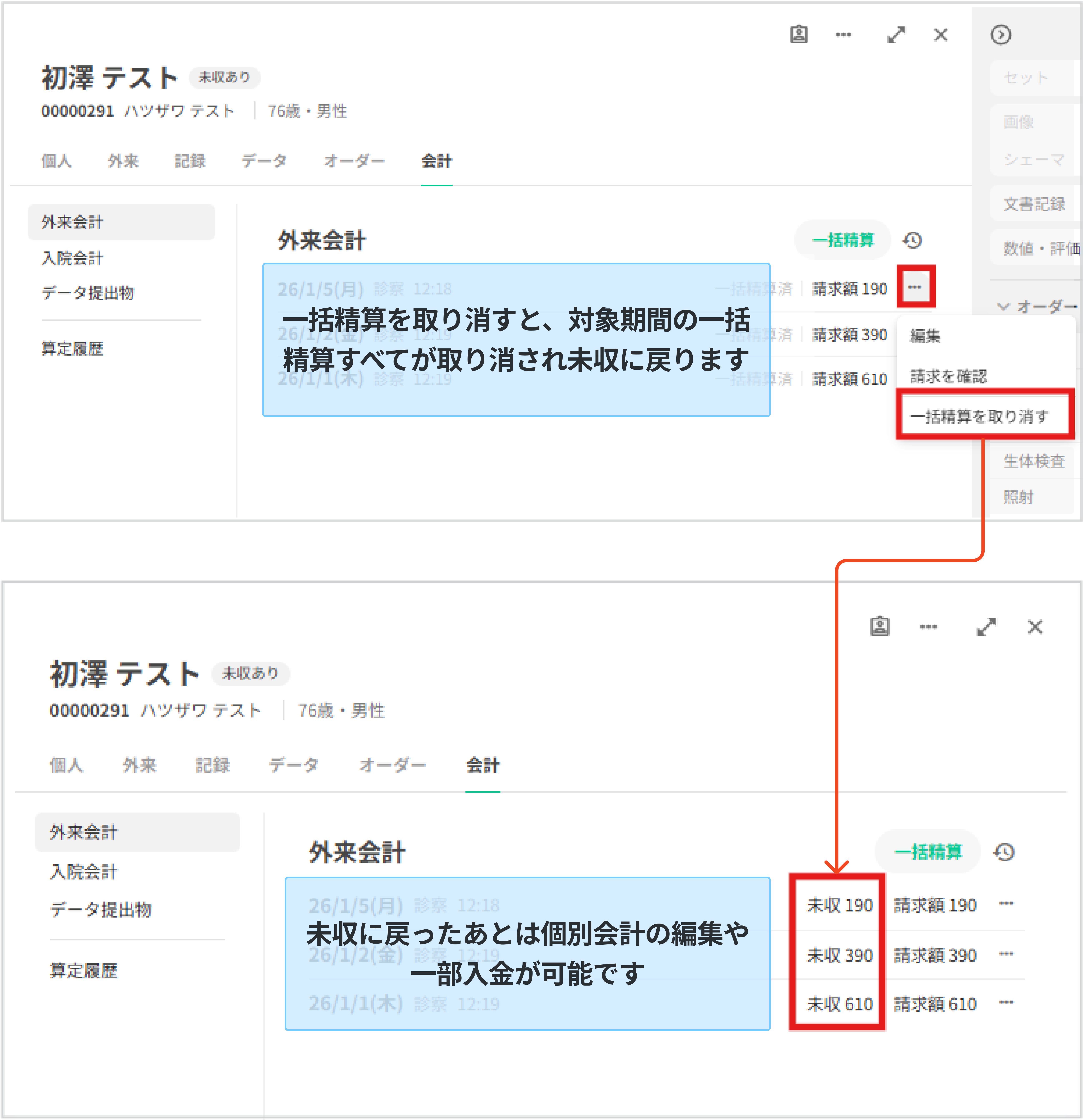外来一括精算をした状態では、個別の会計内容を変更・削除したり、一部入金することができません。一括精算の取り消しを行う必要があるため、手順を解説します。