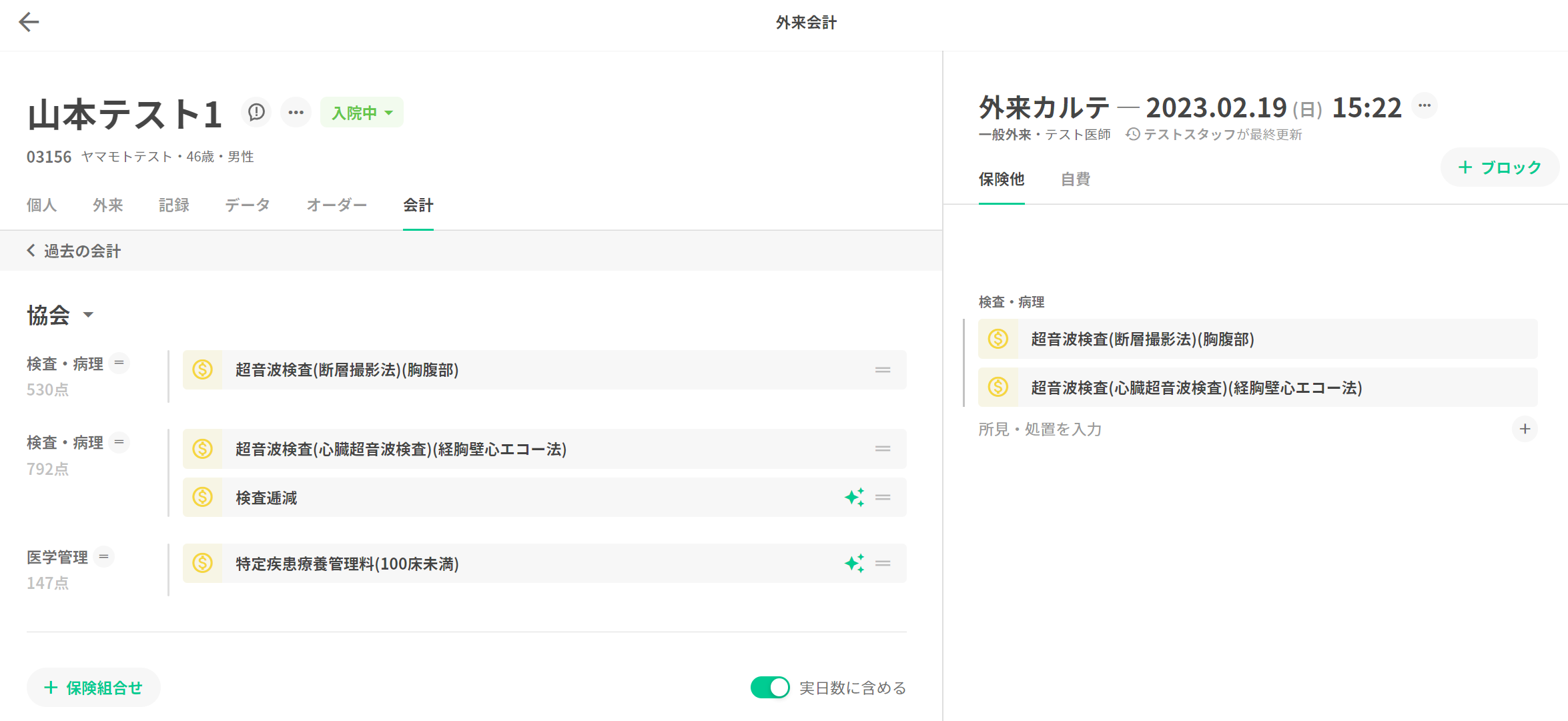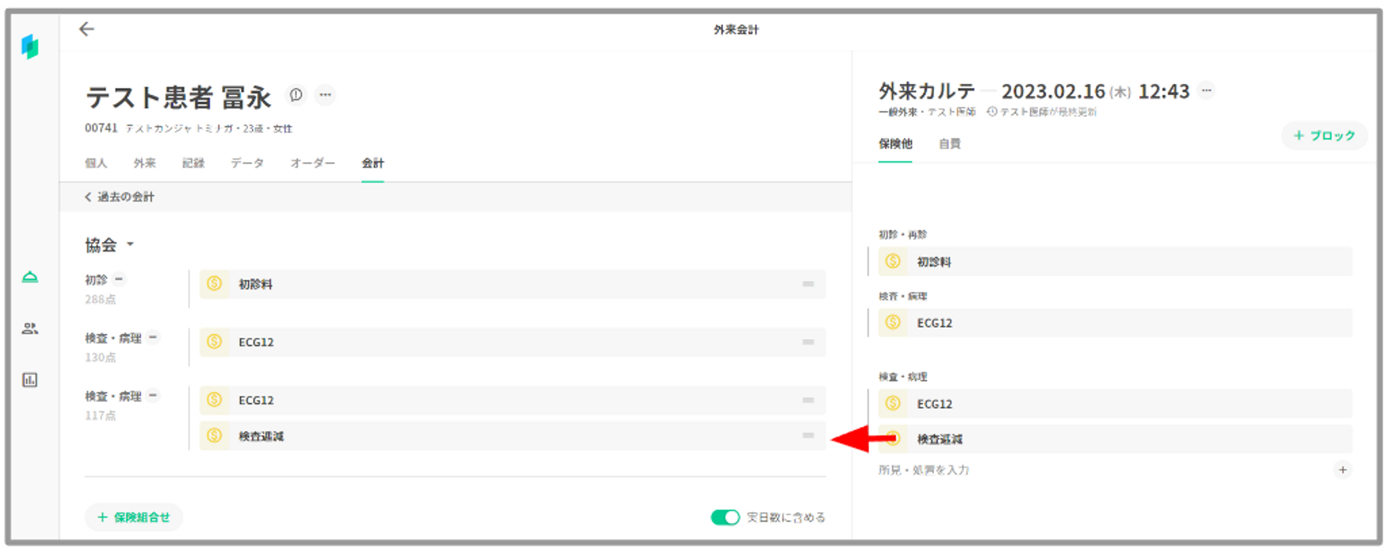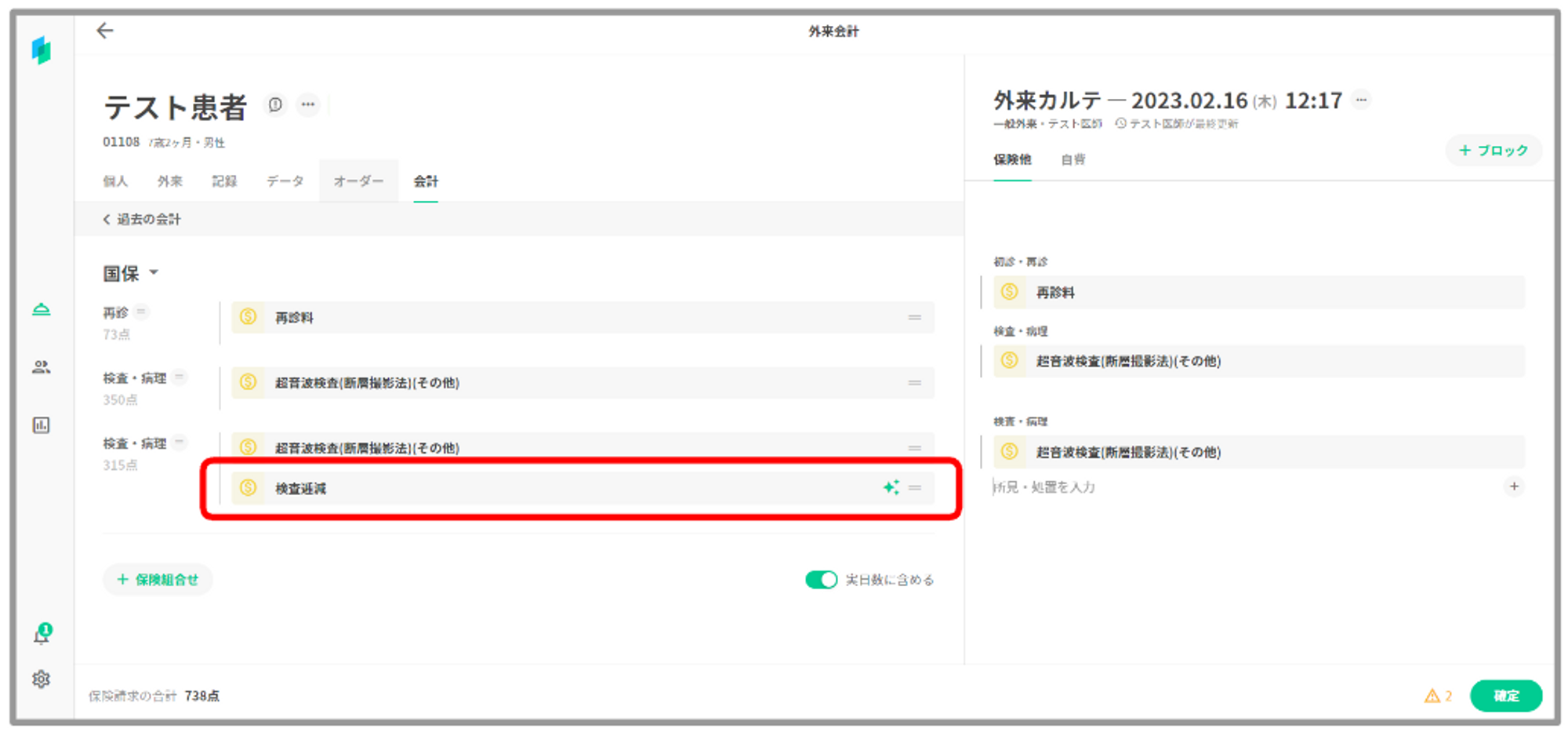 検査逓減料が算定されますので、会計画面にて手修正をお願い致します。