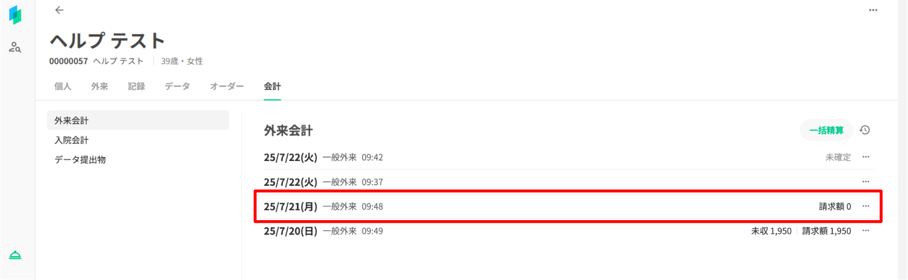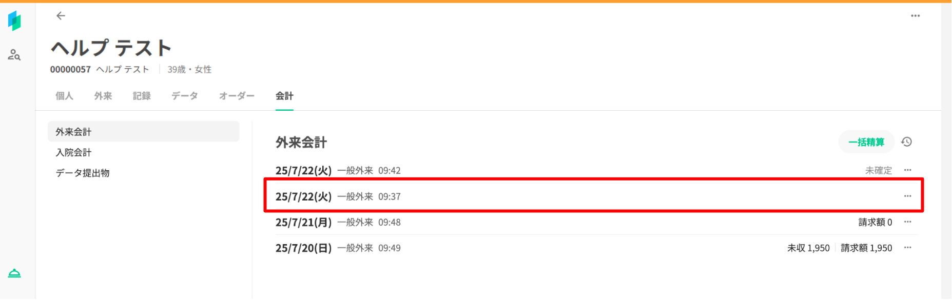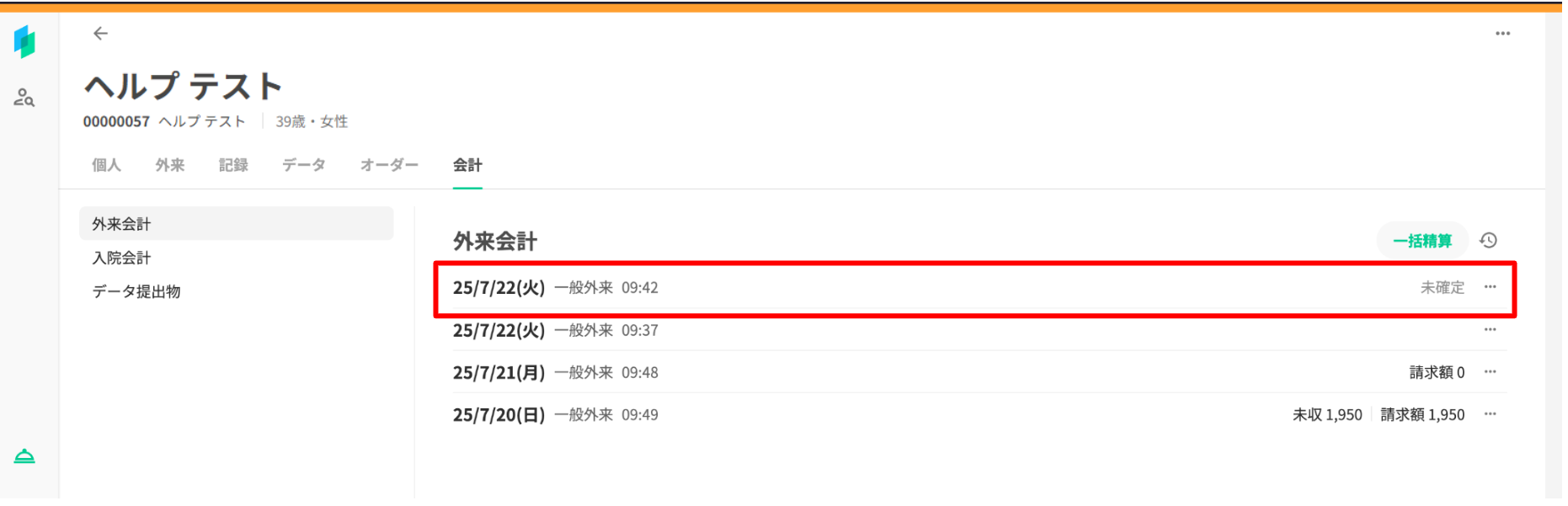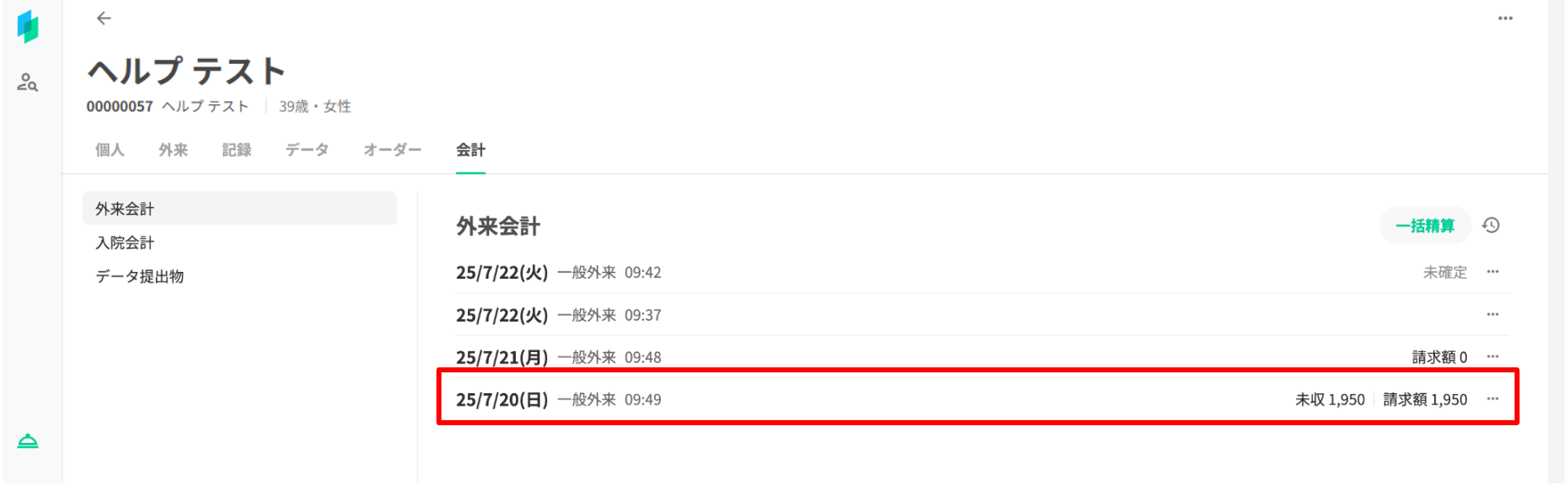 外来会計一覧画面での表示は以下の通りです