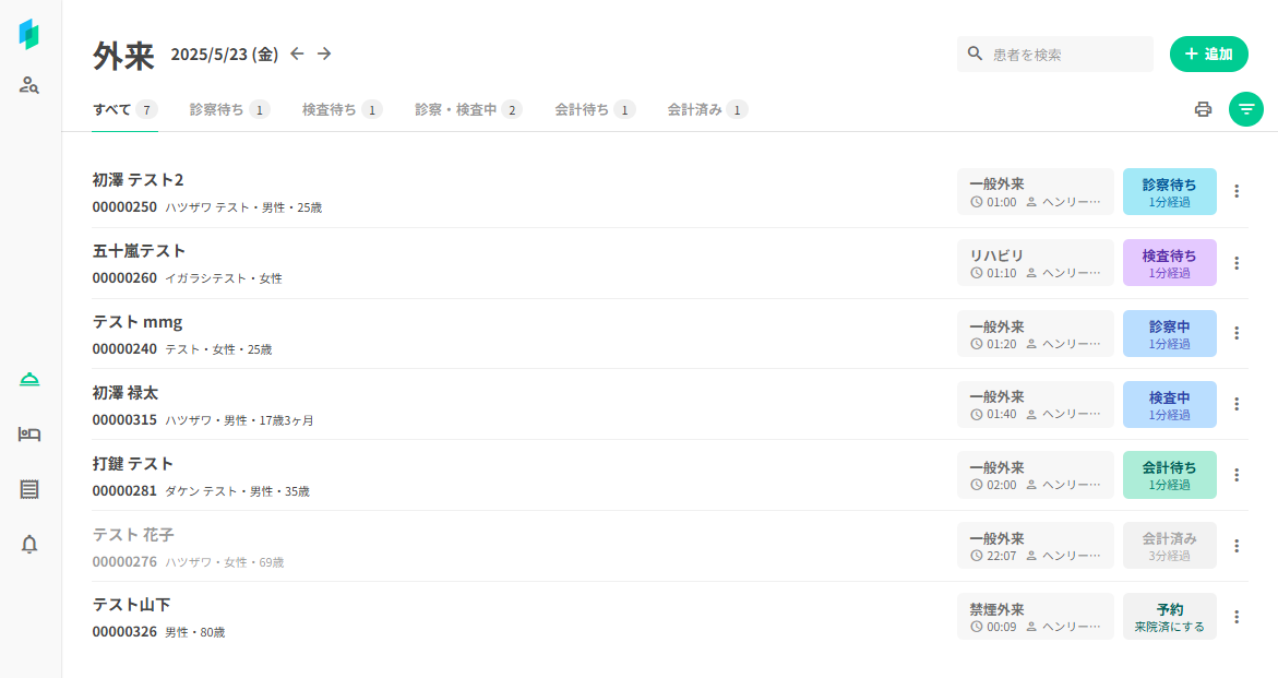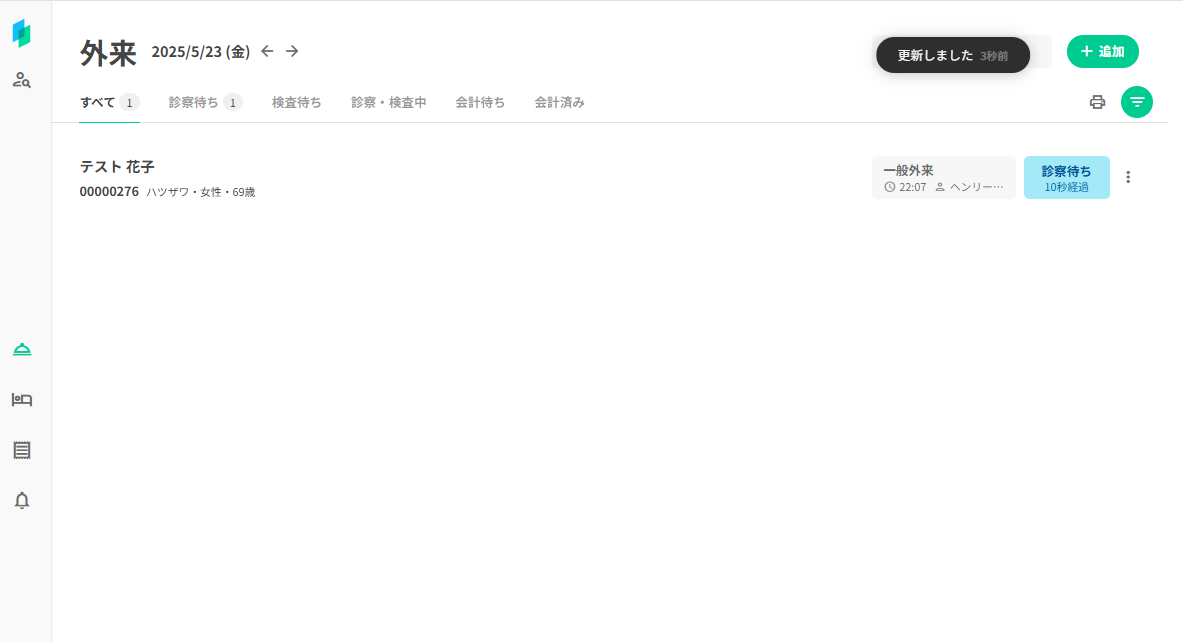 患者が来院したら、追加ボタンより患者検索画面で氏名またはIDで検索し該当患者を選択します。