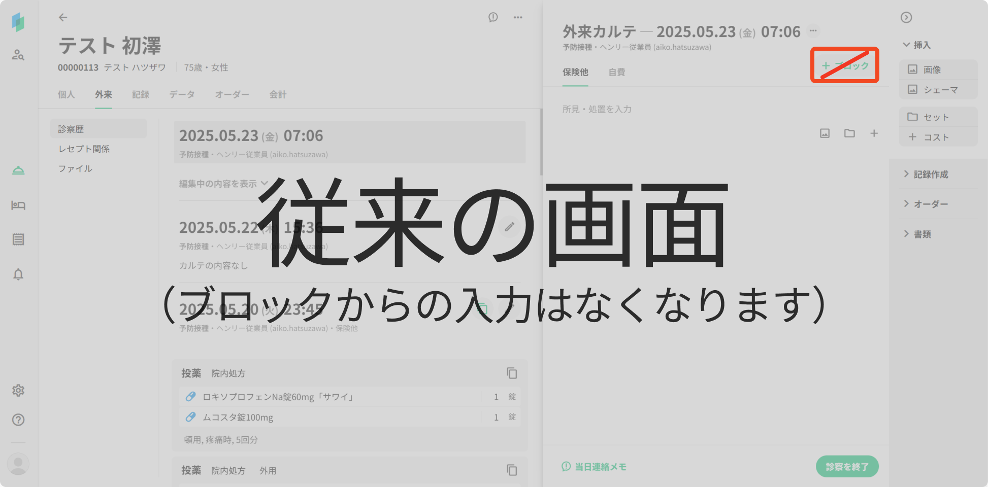 従来は「ブロック」ボタンから診療項目を検索して入力していました。