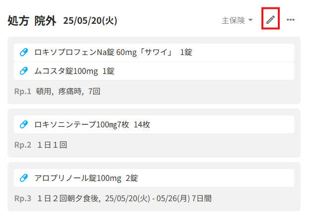 Doしたオーダーは鉛筆マークのアイコンから編集できます。 用法・用量を確認し、必要に応じて修正します。