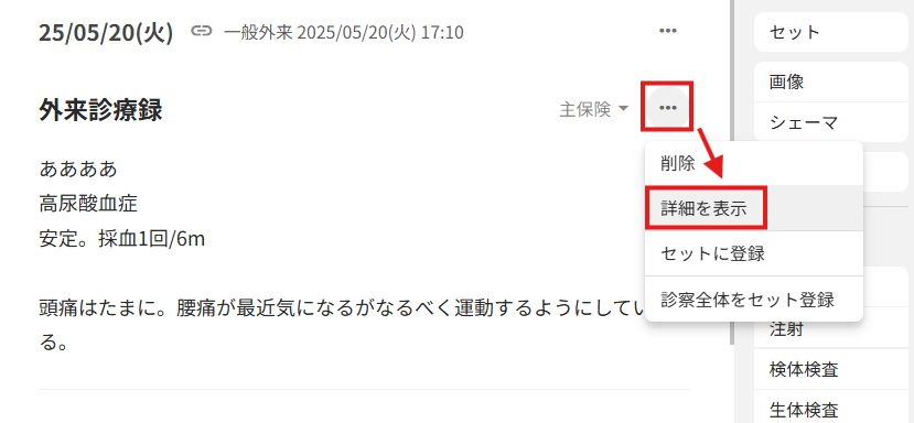 「外来診療録」欄にテキストで今日の症状や所見を入力します。 セットを作成し、必要に応じて定型文を挿入することもできます。