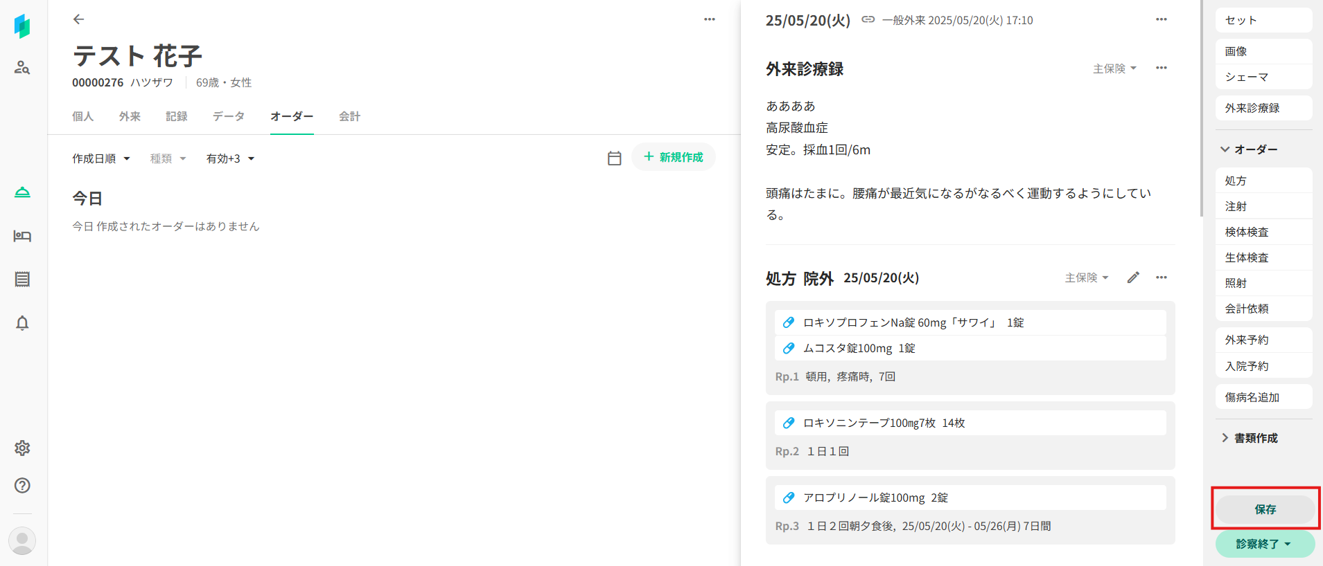 診察途中で保存したい場合は「保存」ボタンをクリックしてください。
