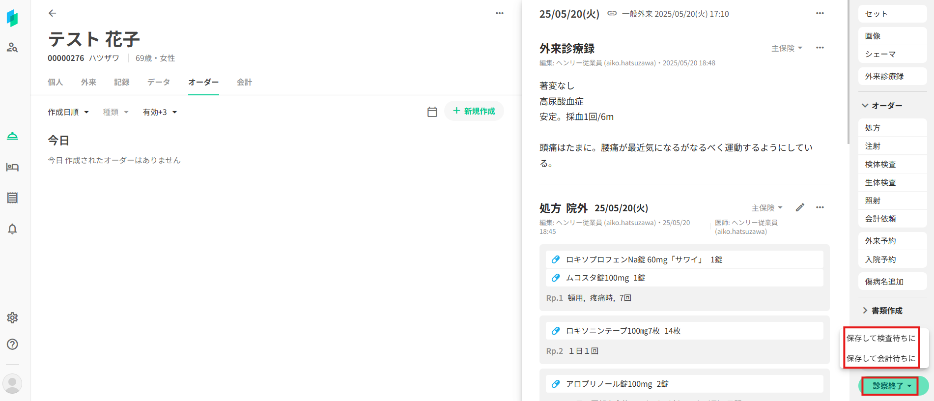 診察終了時に「保存して会計待ちに」あるいは「保存して検査待ちに」を選択すると、保存と同時に「診察中」ステータスから「会計待ち」あるいは「検査待ち」に移行します。
