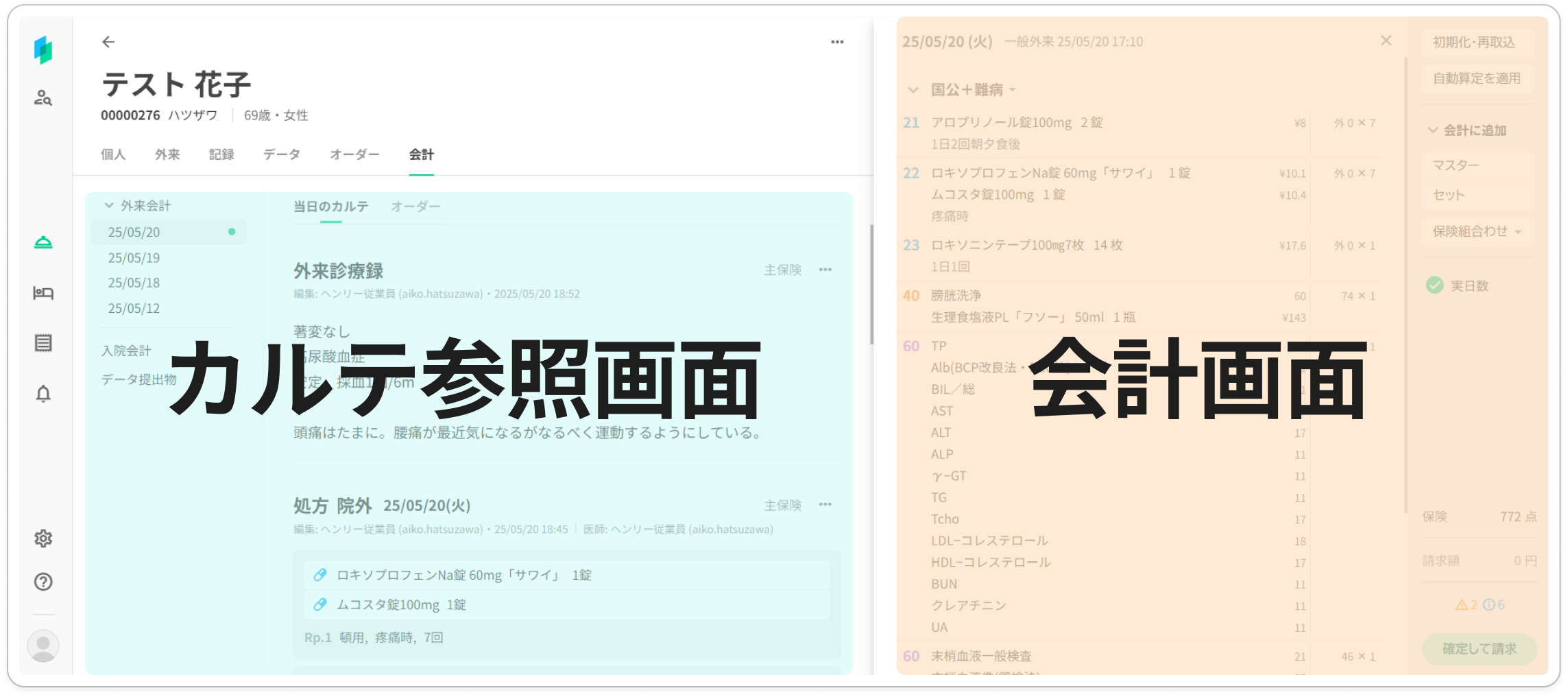 従来の画面とは、カルテ参照画面と会計画面の表示が左右逆になりますのでご留意ください。左側:カルテ参照画面 右側:会計画面