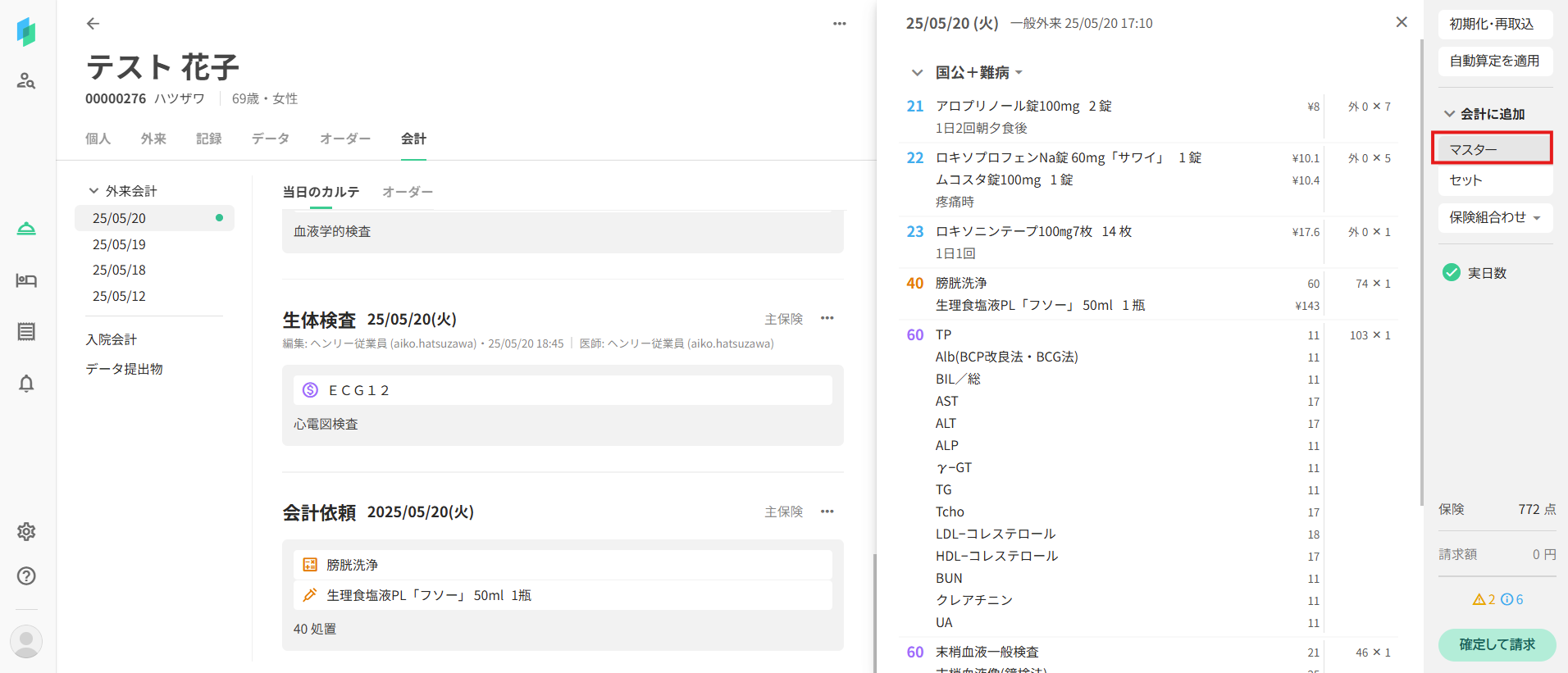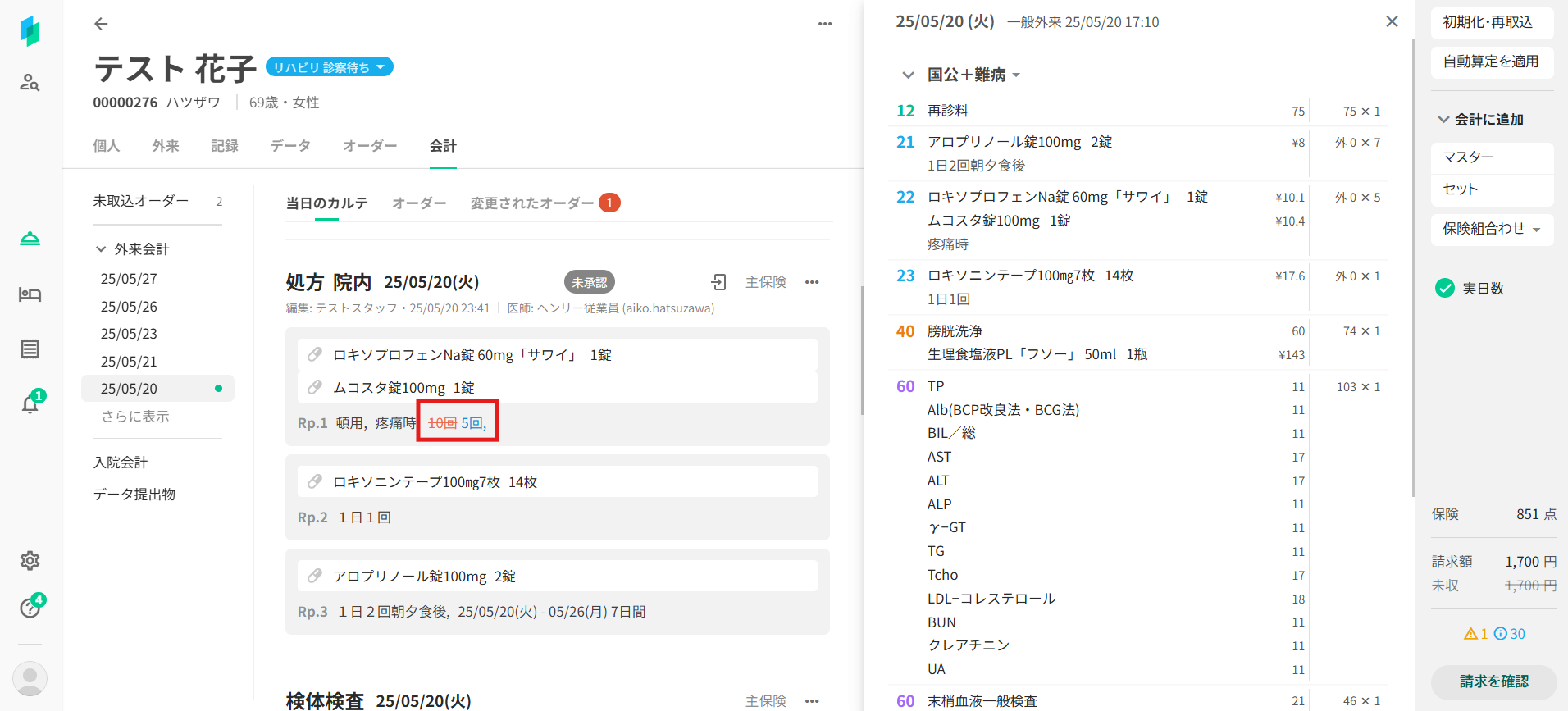 従来はカルテと会計が同期していたため、コストを追加・修正するためにはカルテを編集する必要がありました。リニューアル後は、会計単体でコストを追加・修正することができるようになります。 また、上記により、会計側での算定単位の分割・結合をオーダー側に影響させず会計画面のみ修正することができます。