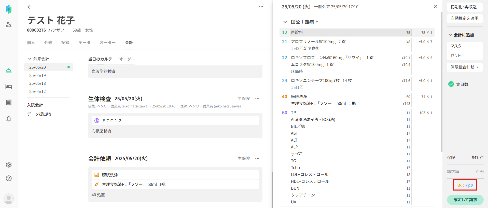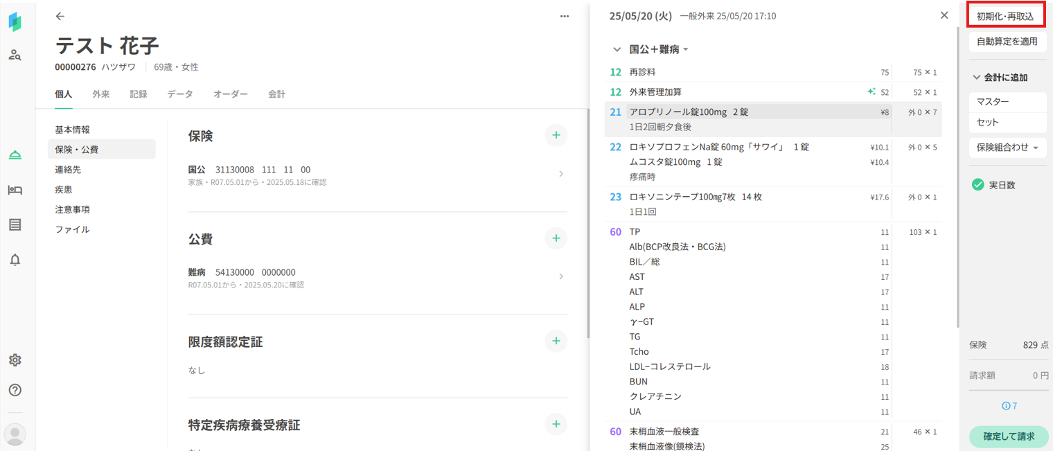 右上の「初期化・再取込」をクリックすると、会計側での修正内容を初期化し再度カルテとの連携が行われます。会計側で手入力で追加・修正した内容は失われますのでご注意ください。