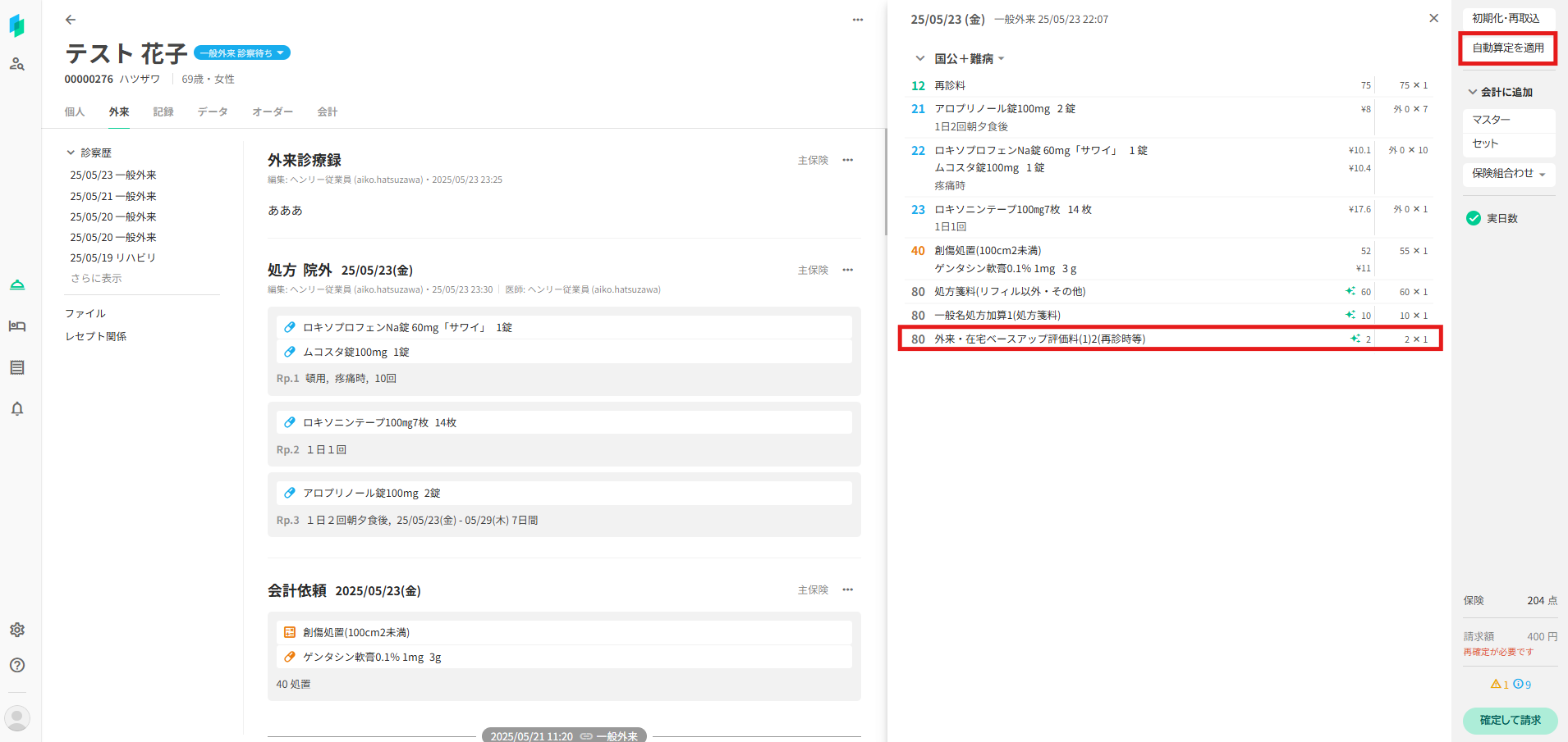 従来は会計画面を開いたときにのみ自動算定されていましたが、リニューアル後は「自動算定を適用」をクリックすることで随時自動算定の処理が可能です。