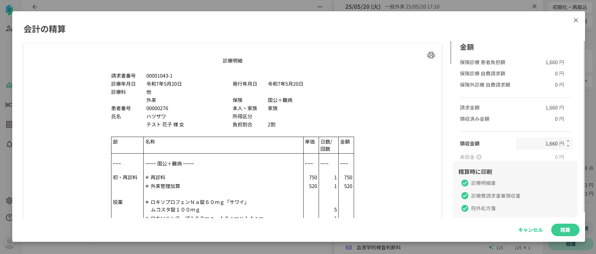請求書兼領収書、明細書、処方箋のプレビューが表示されるので内容を確認し、問題なければ精算ボタンをクリックして終了します。