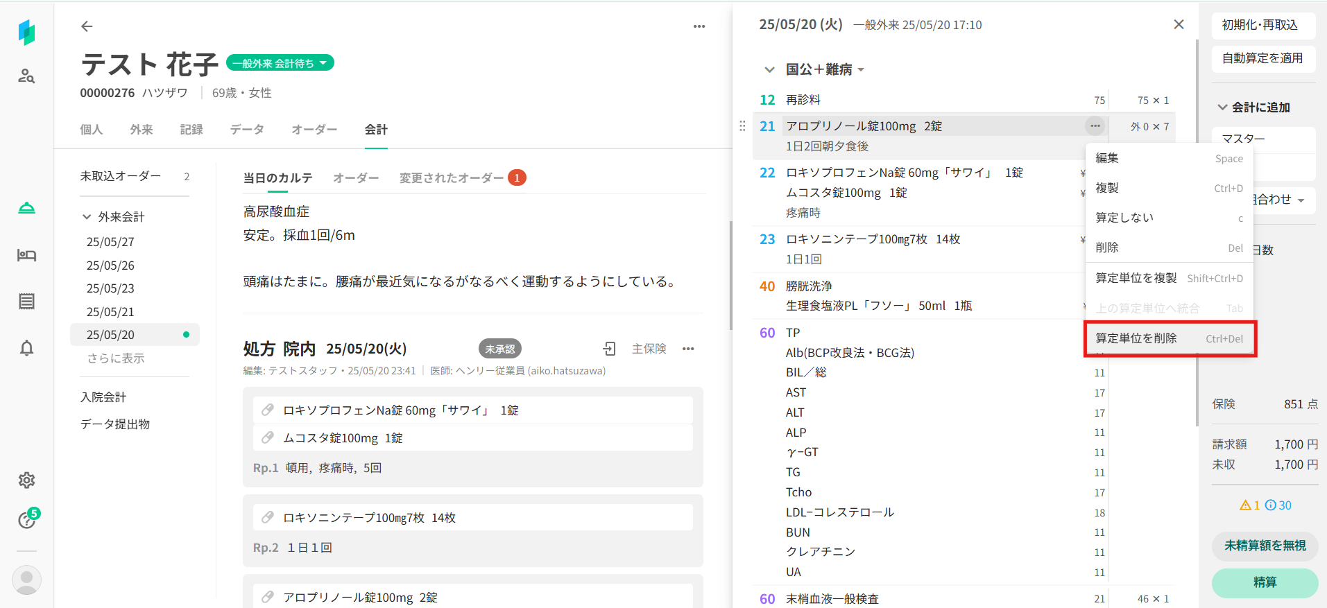 変更された処方オーダーを再取込する前に、すでに取り込み済の当該処方コストを会計画面から削除します。
