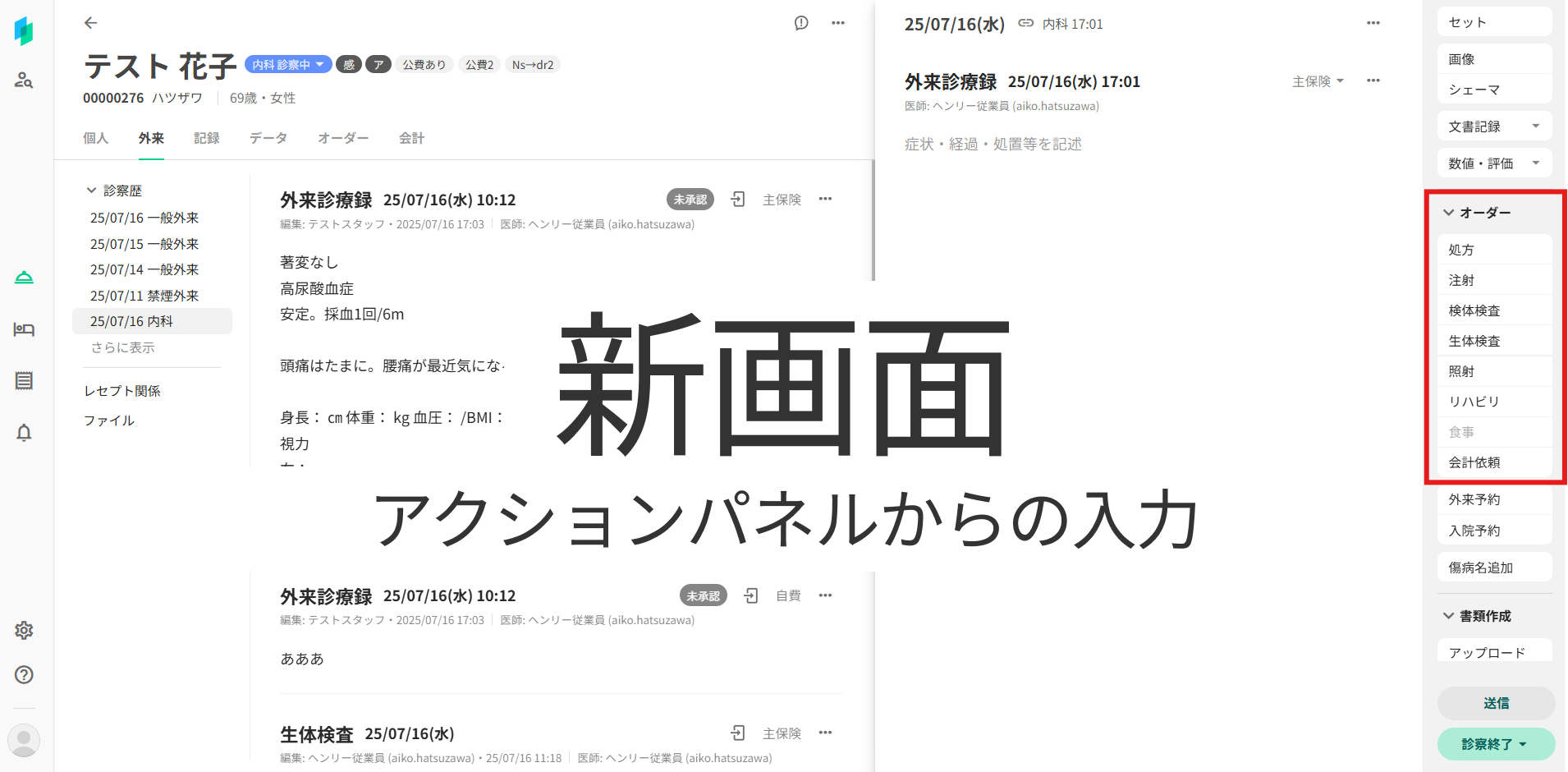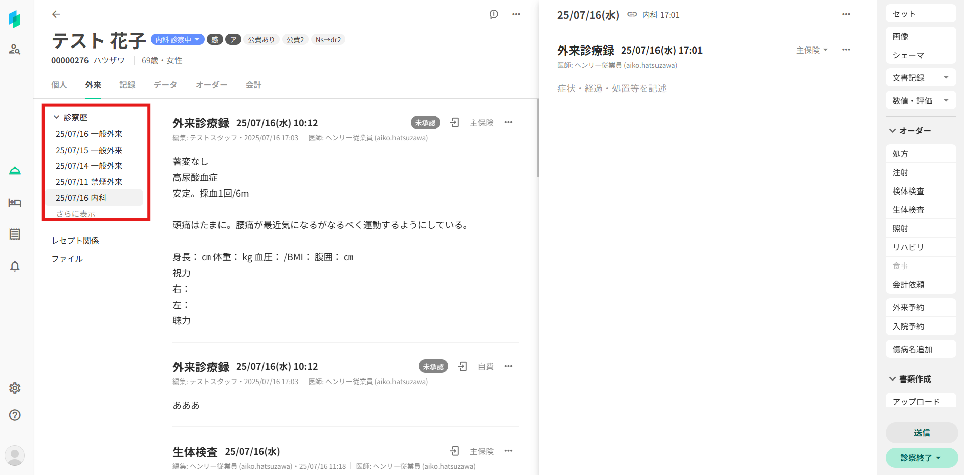 医師画面の「診察待ち」一覧から該当患者を選択します。 カルテを開きます。画面左半分に過去のカルテ、右半分に当日のカルテ、右端にアクションパネルが表示されます。