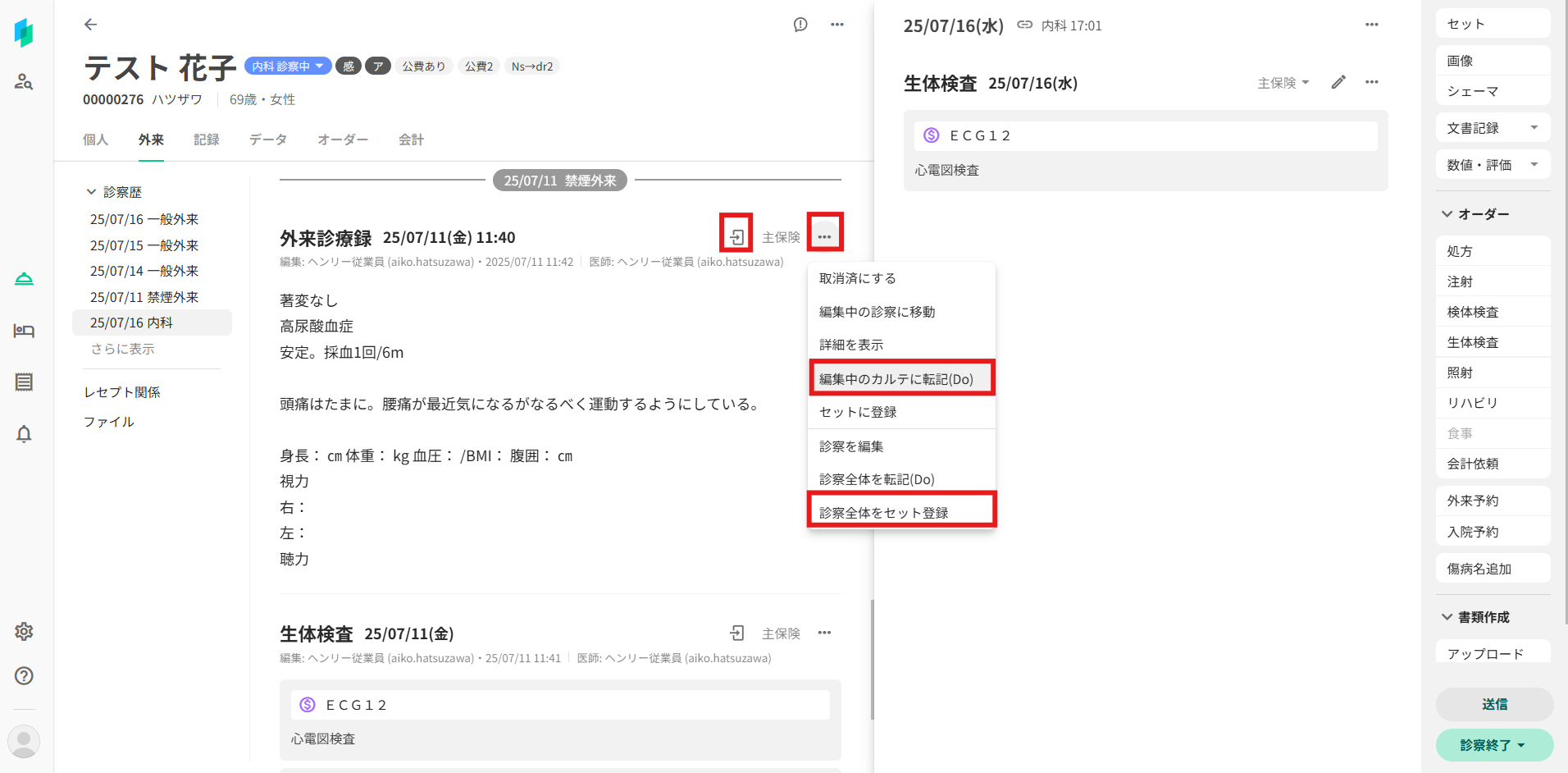 過去のオーダーと外来診療録をまとめて転記(Do)することができます。過去のオーダーや外来診療録の横にある「・・・」から「診察全体を転記(Do)」を選択してください。