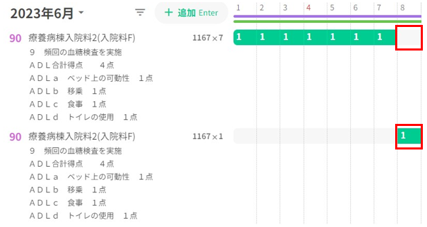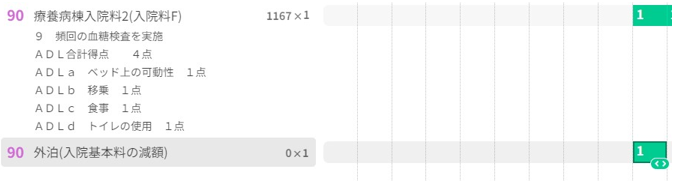 入院料の下にマウスを当てるとクリックして挿入が表示するので(緑の下線が表示される)、クリックし、外泊(入院基本料の減額)を入力する