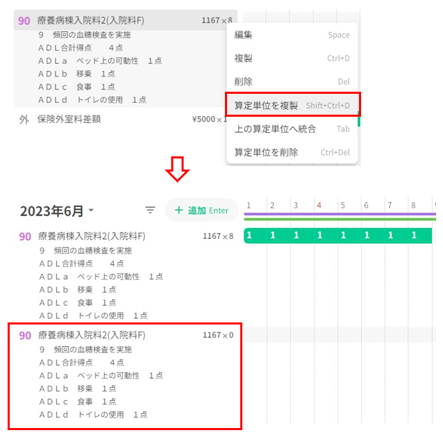 外泊を入力する入院料を「算定単位を複製」します。