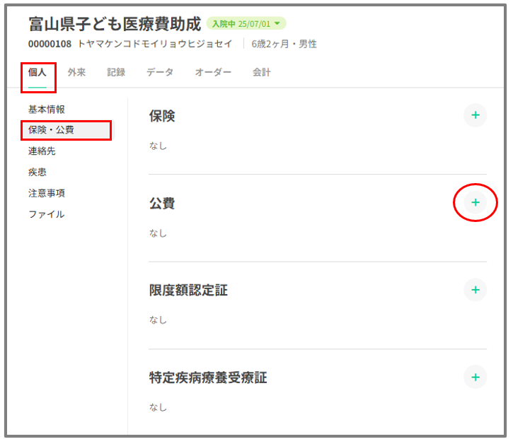 ・個人タブの保険・公費から公費欄の「+」を押下します。