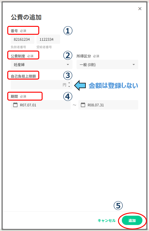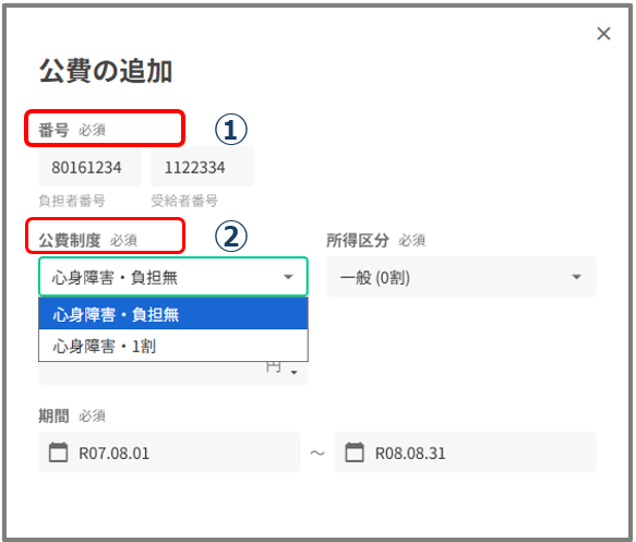 ②負担者番号・受給者番号を入力すると、該当する公費制度が選択できるようになります。