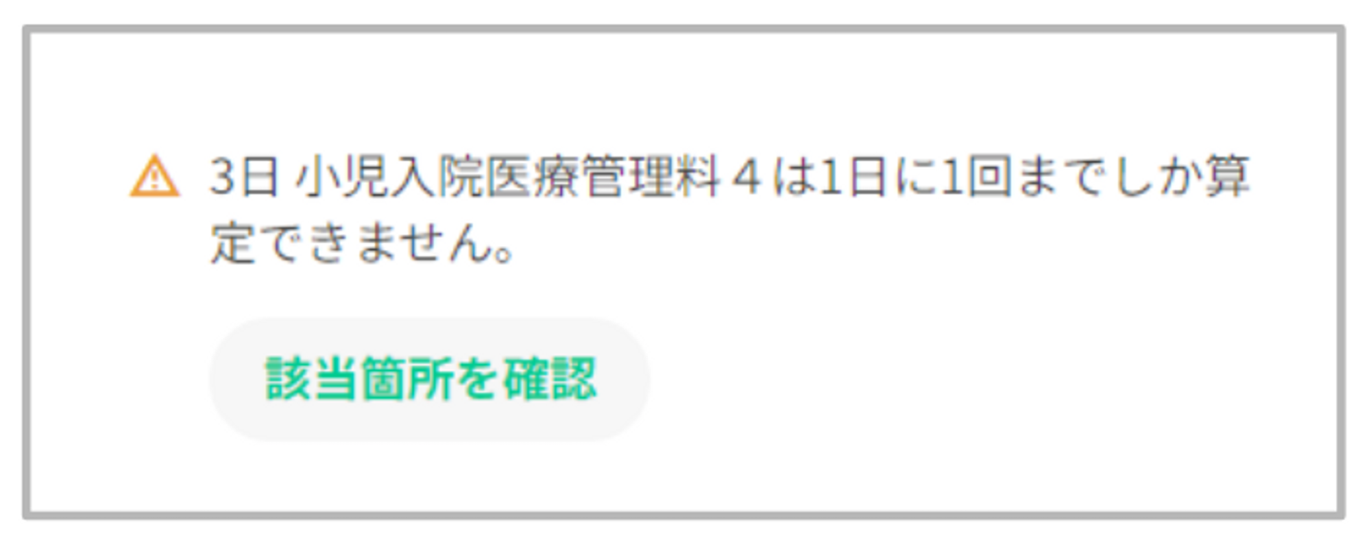 小児入院医療管理料のみ算定されており、「プレイルーム、保育士等加算(小児入院医療管理料)」が算定されていない場合は、確認メッセージが表示されます。