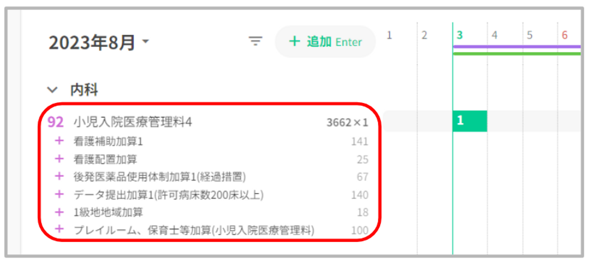 入院基本料等加算は、「小児入院医療管理料」と同じ算定単位に自動算定いたします。