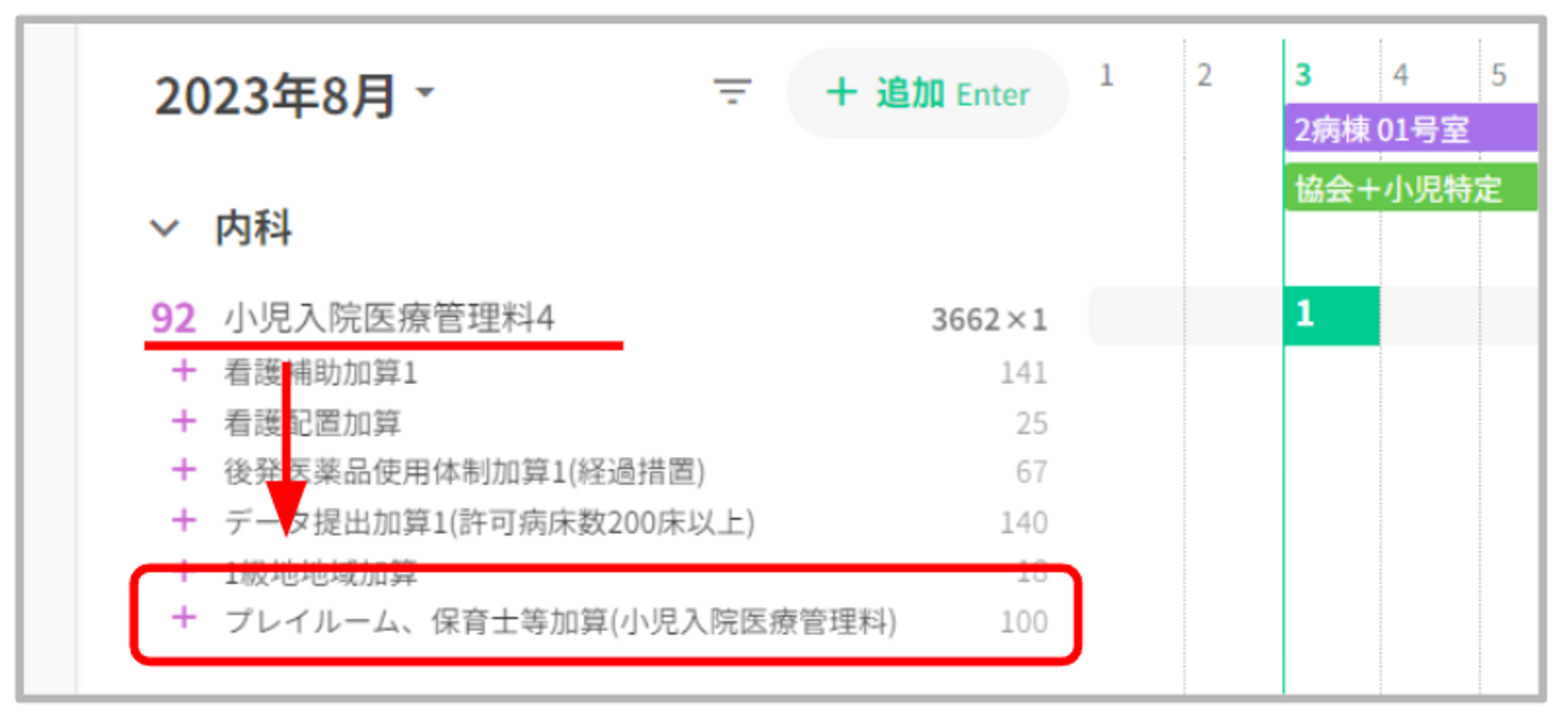 「プレイルーム、保育士等加算(小児入院医療管理料)」の対象病棟に入院しており、小児入院医療管理料を算定している場合、「プレイルーム、保育士等加算(小児入院医療管理料)」を自動算定いたします。