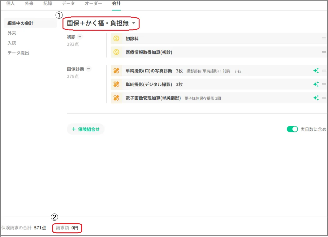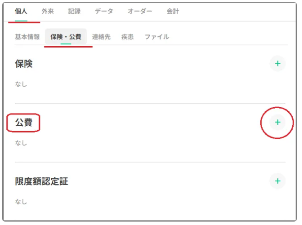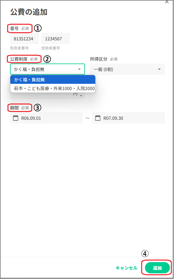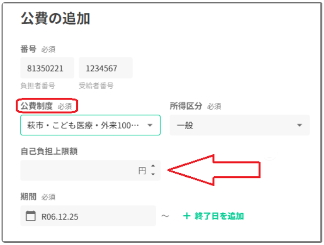 ・所得区分は、公費制度を選択すると自動で反映されます。公費制度は、医療証の一部自己負担金の金額を参照に入力します。